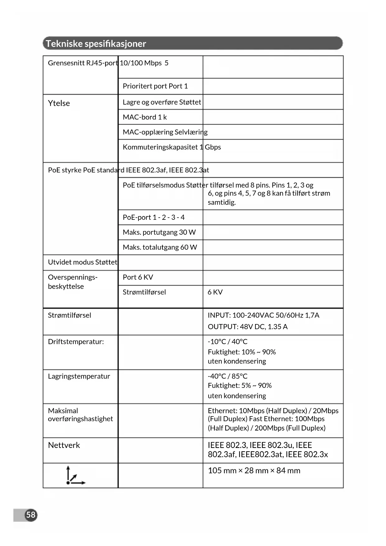 Poorten 1-4: van 100 meter tot 300 meter / 10MB57 NL58 Tekniske spesikasjoner Grensesnitt RJ45-port 10/100 Mbps 5 Prioritert port Port 1 Ytelse Lagre og overføre Støttet MAC-bord 1 k MAC-opplæring Selvlæring Kommuteringskapasitet 1 Gbps PoE styrke PoE standard IEEE 802.3af, IEEE 802.3at PoE tilførselsmodus Støtter tilførsel med 8 pins. Pins 1, 2, 3 og 6, og pins 4, 5, 7 og 8 kan få tilført strøm samtidig. PoE-port 1 - 2 - 3 - 4 Maks. portutgang 30 W Maks. totalutgang 60 W Utvidet modus Støttet Overspennings- beskyttelse Port 6 KV Strømtilførsel 6 KV Strømtilførsel INPUT: 100-240VAC 50/60Hz 1,7A