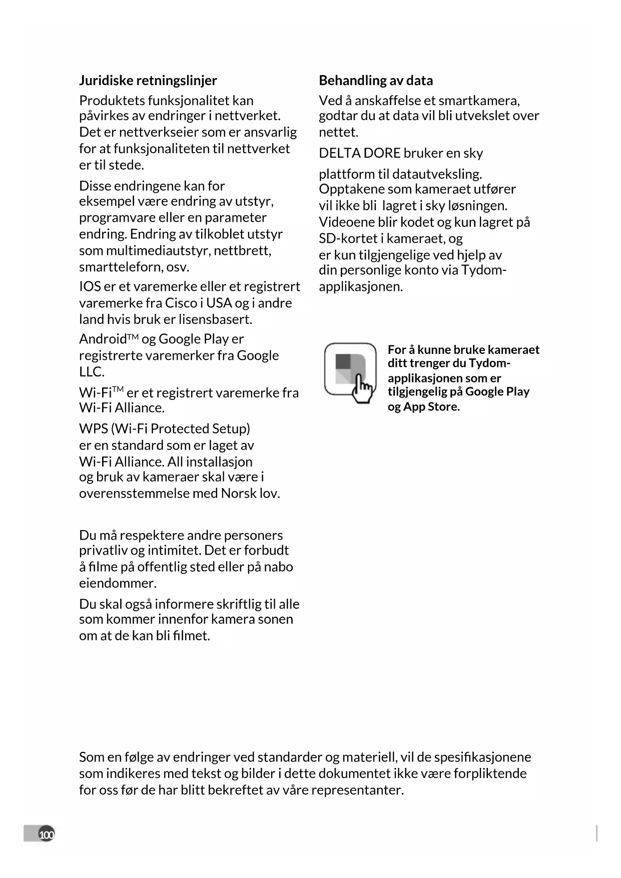 er et registrert varemerke fra Wi-Fi Alliance. WPS (Wi-Fi Protected Setup) er en standard som er laget av Wi-Fi Alliance. All installasjon og bruk av kameraer skal være i overensstemmelse med Norsk lov. Du må respektere andre personers privatliv og intimitet. Det er forbudt å lme på offentlig sted eller på nabo eiendommer. Du skal også informere skriftlig til alle som kommer innenfor kamera sonen om at de kan bli lmet. Behandling av data Ved å anskaffelse et smartkamera, godtar du at data vil bli utvekslet over nettet. DELTA DORE bruker en sky plattform til datautveksling. Opptakene som kameraet utfører vil ikke bli lagret i sky løsningen. Videoene blir kodet og kun lagret på SD-kortet i kameraet, og er kun tilgjengelige ved hjelp av din personlige konto via Tydom- applikasjonen. For å kunne bruke kameraet ditt trenger du Tydom- applikasjonen som er tilgjengelig på Google Play og App Store. Som en følge av endringer ved standarder og materiell, vil de spesikasjonene som indikeres med tekst og bilder i dette dokumentet ikke være forpliktende for oss før de har blitt bekreftet av våre representanter.101