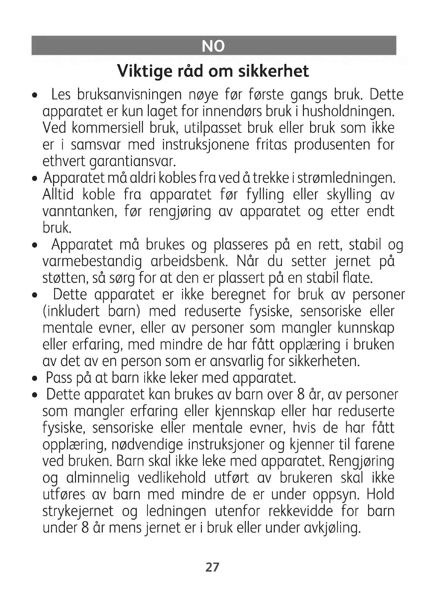 - Dette apparatet er ikke beregnet for bruk av personer (inkludert barn) med reduserte fysiske, sensoriske eller mentale evner, eller av personer som mangler kunnskap eller erfaring, med mindre de har fått opplæring i bruken av det av en person som er ansvarlig for sikkerheten.
