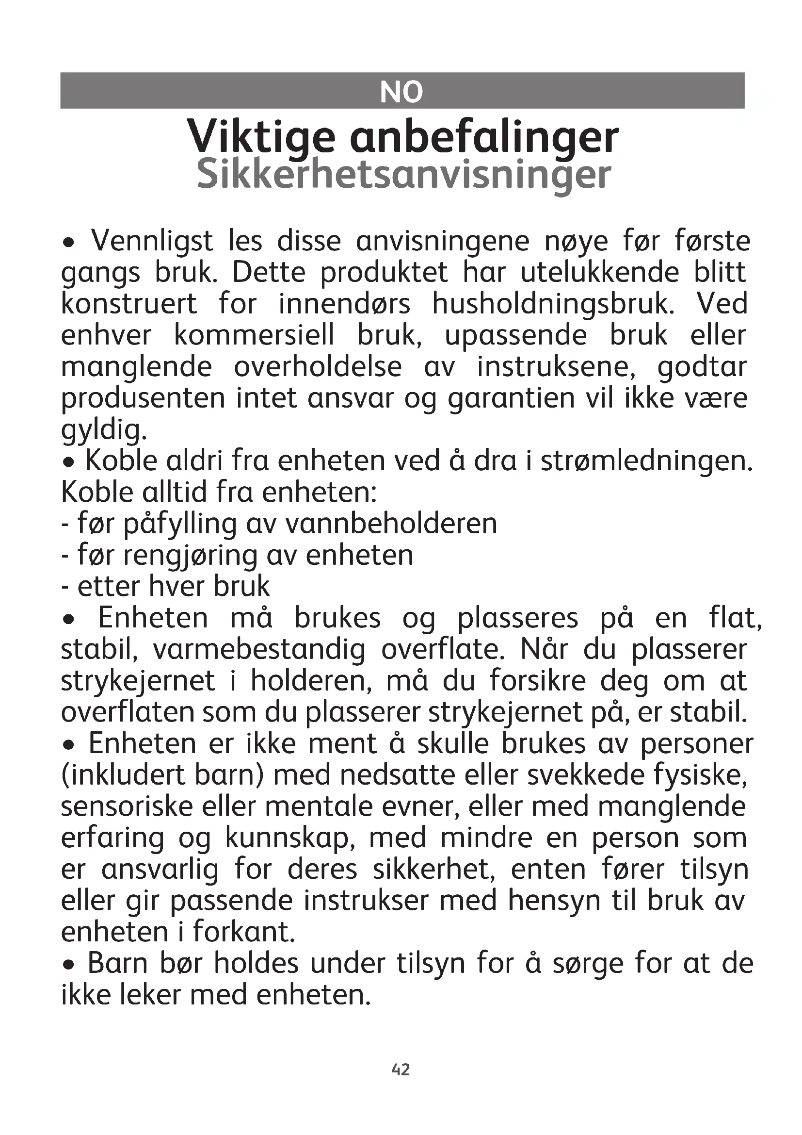 - Denne enheten kan brukes av barn som er 8 år eller eldre, og av personer med manglende erfaring og kunnskap, eller av personer med nedsatte eller svekkede fysiske, sensoriske eller mentale evner, gitt at de har blitt grundig instruert med hensyn til bruk av enheten, har tilsyn og forstår risikoen som er involvert. Barn skal ikke leke med enheten. Rengjøring og brukervedlikehold skal ikke utføres av barn uten tilsyn. Hold strykejernet og ledningen utenfor rekkevidde for barn under 8 år mens jernet er i bruk eller under avkjøling.
