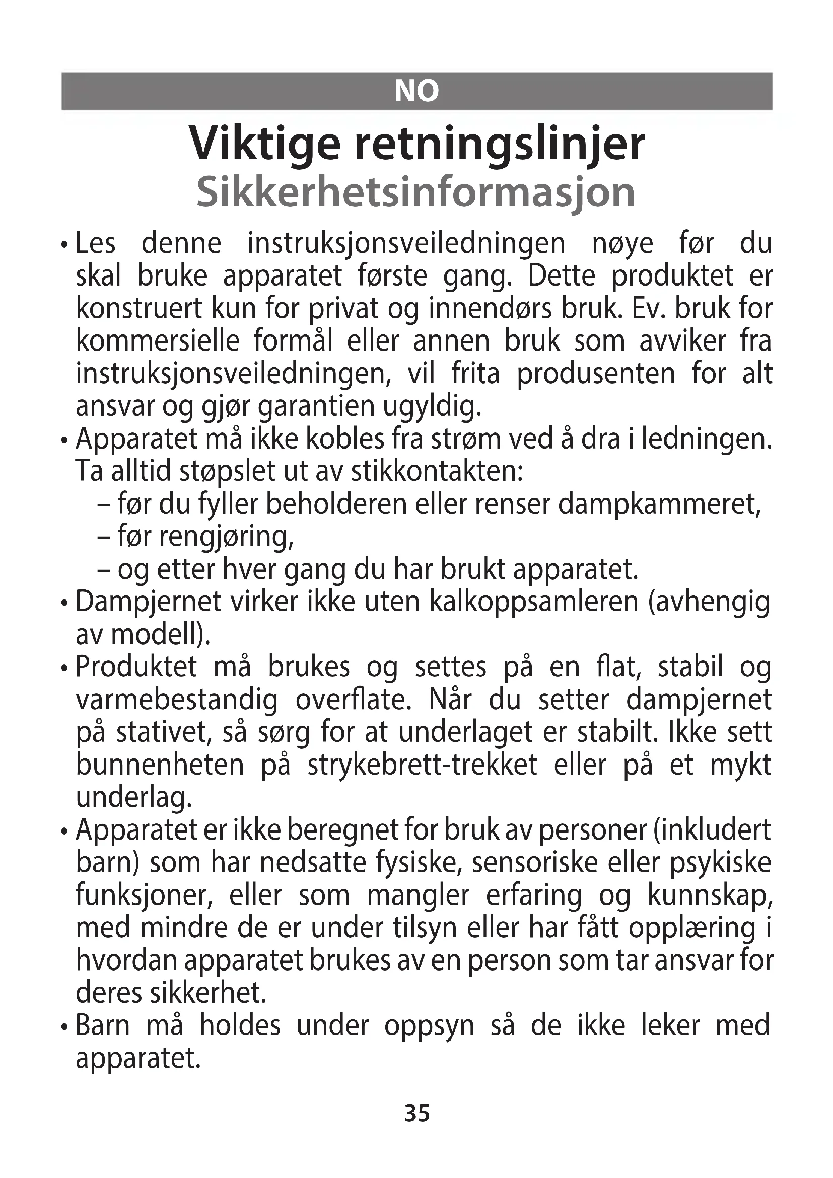 - Dampjernet er et elektrisk produkt og må brukes under normale bruksforhold.