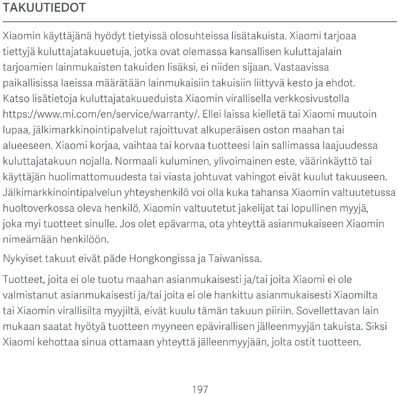 Batteritype: Litium-ion-polymerbatteri Inngangsspenning: 5 V Inngangsstrøm: 1 A Driftstemperatur: 0 °C til 45 °C Maksimal utgangseffekt ≤13 dBm Driftsfrekvens: 2400-2483,5 MHz Spesifikasjoner Bluetooth®-ordmerket og logoer er registrerte varemerker som eies av Bluetooth SIG, Inc. og all bruk av slike merker av Xiaomi Inc. er under lisens. Andre varemerker og varenavn tilhører sine respektive eiere. 209Alle produkter som bærer dette symbolet er elektrisk og elektronisk avfall (WEEE som i direktiv 2012/19/EU) som ikke skal blandes med usortert husholdningsavfall. I stedet bør du beskytte menneskers helse og miljø ved å overlevere e-avfallet til et utpekt innsamlingssted for resirkulering av elektrisk og elektronisk utstyr, oppnevnt av myndighetene eller lokale myndigheter. Riktig avhending og resirkulering vil bidra til å forhindre potensielle negative konsekvenser for miljøet og menneskers helse. Ta kontakt med installatøren eller lokale myndigheter for mer informasjon om stedet samt vilkår og betingelser for slike innsamlingspunkter. Informasjon om overholdelse av forskrifter EU-samsvarserklæring Herved erklærer Xiaomi Communications Co., Ltd. at radioutstyrstypen M2109W1 er i samsvar med direktiv 2014/53/EU. Den fullstendige teksten i EUs samsvarserklæring er tilgjengelig på følgende Internett-adresse: http://www.mi.com/global/service/support/declaration.html For juridisk informasjon, produktsertifisering og samsvarslogoer relatert til Redmi Watch 2 Lite , gå til Settings >About Watch> Regulatory. 210GARANTIVARSEL Som Xiaomi-forbruker drar du nytte av visse vilkår fra ekstra garantier. Xiaomi tilbyr spesifikke forbrukergarantifordeler som kommer i tillegg til, og ikke i stedet for, eventuelle juridiske garantier gitt av din nasjonale forbrukerlov. Varigheten og betingelsene knyttet til de juridiske garantiene er gitt av de respektive lokale lovene. For mer informasjon om forbrukergarantifordelene, se Xiaomis offisielle nettside https://www.mi.com/en/service/warranty/. Med unntak av det som er forbudt ved lov eller på annen måte lovet av Xiaomi, skal ettersalgstjenestene være begrenset til landet eller regionen til det opprinnelige kjøpet. I henhold til forbrukergarantien, i den grad loven tillater det, vil Xiaomi etter eget skjønn reparere, erstatte eller refundere produktet ditt. Normal slitasje, force majeure, misbruk eller skade forårsaket av brukerens uaktsomhet eller feil dekkes ikke av garantien. Kontaktpersonen for ettersalgstjenesten kan være enhver person i Xiaomis autoriserte servicenettverk, Xiaomis autoriserte distributører eller den endelige leverandøren som solgte produktene til deg. Hvis du er i tvil, kontakt den aktuelle personen som Xiaomi kan identifisere. De nåværende garantiene gjelder ikke i Hong Kong og Taiwan. Produkter som ikke ble behørig importert og/eller ikke ble behørig produsert av Xiaomi og/eller ikke ble behørig kjøpt fra Xiaomi eller en Xiaomis offisielle selger, dekkes ikke av de nåværende garantiene. I henhold til gjeldende lov kan du dra nytte av garantier fra den ikke-offisielle forhandleren som solgte produktet. Derfor inviterer Xiaomi deg til å kontakte forhandleren som du kjøpte produktet fra. 211Citiți cu atenție acest manual înainte de utilizare și păstrați-l pentru referințe ulterioare. Notă: Ilustrațiile produsului, accesoriilor și interfeței cu utilizatorul din manualul de utilizare sunt doar cu titlu de referință. Produsul și funcțiile reale pot varia din cauza îmbunătățirilor aduse produsului. Prezentare generală a produsului Ecran Ceas Senzor de ritm cardiac Puncte de contact 212Cablu de încărcare Buton de funcții 213Pentru utilizare cotidiană, strângeți confortabil ceasul în jurul încheieturii, la o distanță de aproximativ un deget pe lățime față de osul încheieturii. Ajustați cureaua pentru a vă asigura că senzorul de ritm cardiac poate colecta date în mod normal. Notă: În cazul în care ceasul este prea larg, acest lucru poate afecta colectarea datelor de senzorul de ritm cardiac. Modul de purtare 214Descărcați și instalați aplicația Xiaomi Wear/Xiaomi Wear Lite pentru a gestiona mai bine ceasul și conectați-vă la contul Xiaomi pentru mai multe servicii. Notă: Operațiunea descrisă aici poate să difere puțin de la aplicația Xiaomi Wear/Xiaomi Wear Lite datorită actualizării sale, vă rugăm să urmăriți instrucțiunile de pe ecran.