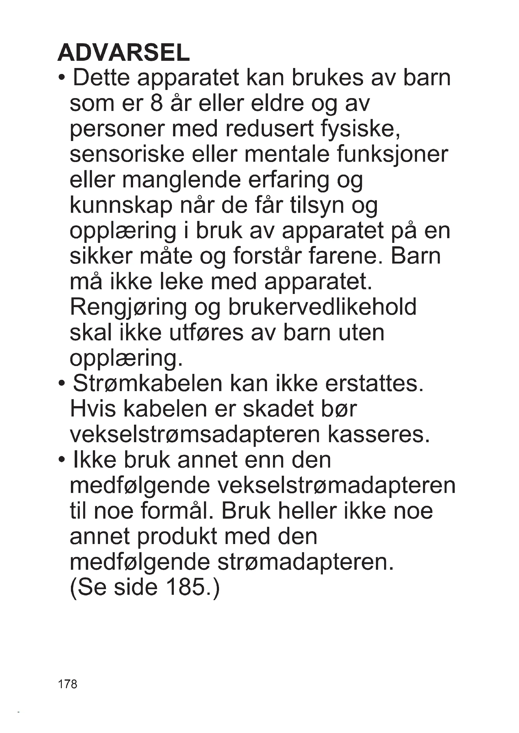 - Dette apparatet kan brukes av barn som er 8 år eller eldre og av personer med redusert fysiske, sensoriske eller mentale funksjoner eller manglende erfaring og kunnskap når de får tilsyn og opplæring i bruk av apparatet på en sikker måte og forstår farene. Barn må ikke leke med apparatet. Rengjøringogbrukervedlikehold skal ikke utføres av barn uten opplæring.