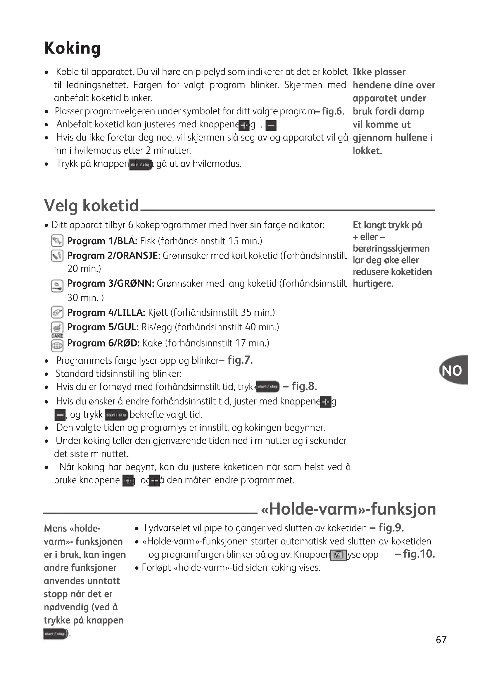 - Når koking har begynt, kan du justere koketiden når som helst ved å bruke knappene og og på den måten endre programmet. «Holde-varm»-funksjon