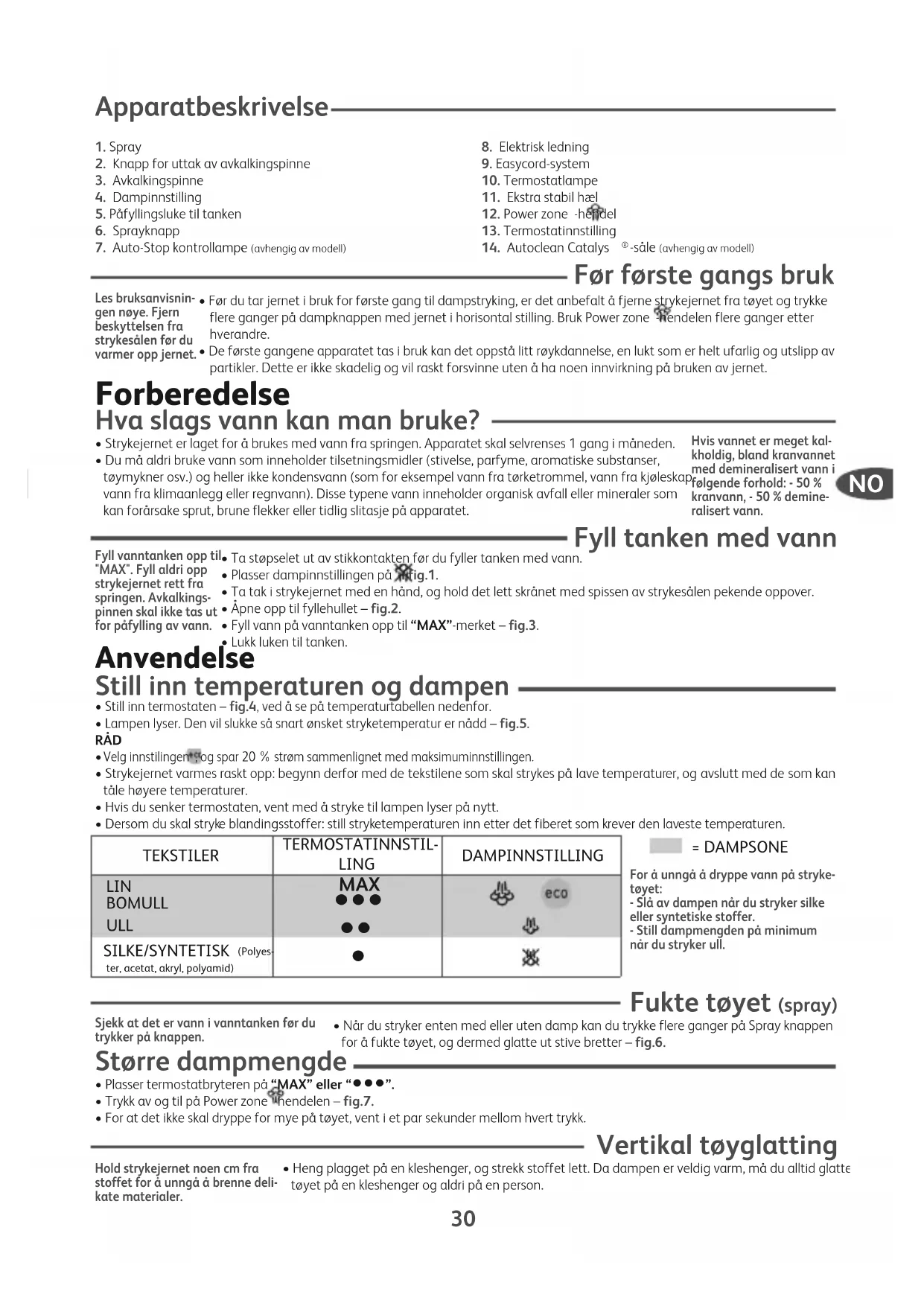 - Still inn temperaturen etter det stoffet som skal strykes.• Sett dampknappen på – fig.1.• Du kan begynne å stryke når lampen slukker. Ekstra funksjoner Autoclean Catalys