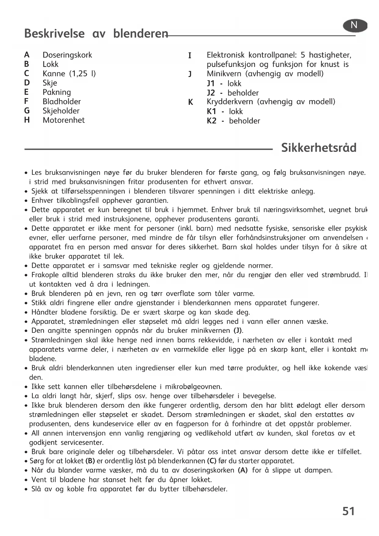 Elektronisk kontrollpanel: 5 hastigheter, pulsefunksjon og funksjon for knust is Minikvern (avhengig av modell) J1 - lokk J2 - beholder Krydderkvern (avhengig av modell) K1 - lokk K2 - beholder N52 Merk: Ikke bland flytende eller faste ingredienser som er varmere enn 80 °C. Når du mikser varme ingredienser, må du holde hendene på avstand fra lokket og doseringskorken for å unngå å brenne deg. Igangsetting