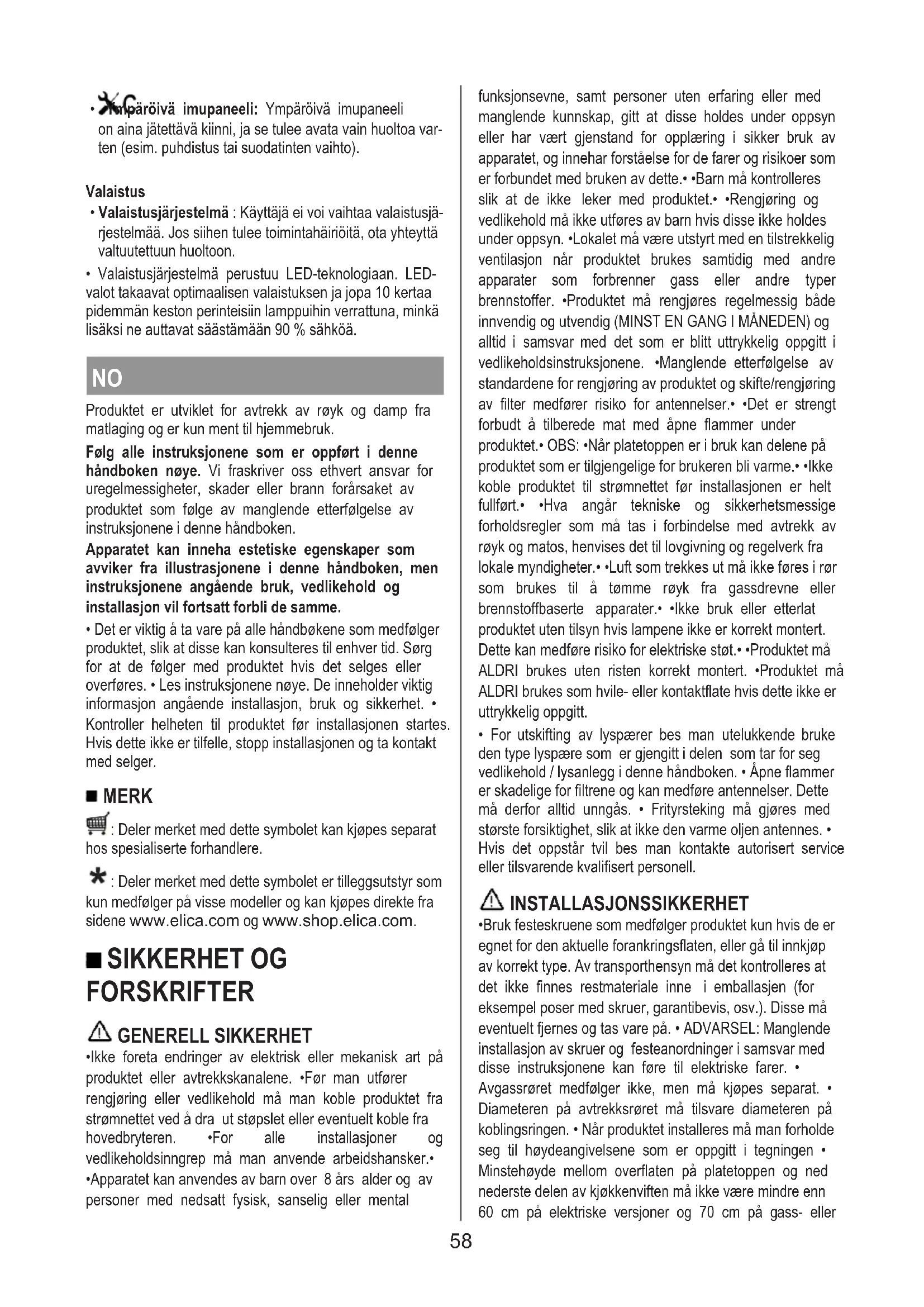 - Det er viktig å ta vare på alle håndbøkene som medfølger produktet, slik at disse kan konsulteres til enhver tid. Sørg for at de følger med produktet hvis det selges eller overføres. • Les instruksjonene nøye. De inneholder viktig informasjon angående installasjon, bruk og sikkerhet. • Kontroller helheten til produktet før installasjonen startes. Hvis dette ikke er tilfelle, stopp installasjonen og ta kontakt med selger. MERK : Deler merket med dette symbolet kan kjøpes separat hos spesialiserte forhandlere. : Deler merket med dette symbolet er tilleggsutstyr som kun medfølger på visse modeller og kan kjøpes direkte fra sidene www.elica.com og www.shop.elica.com. SIKKERHET OG FORSKRIFTER GENERELL SIKKERHET