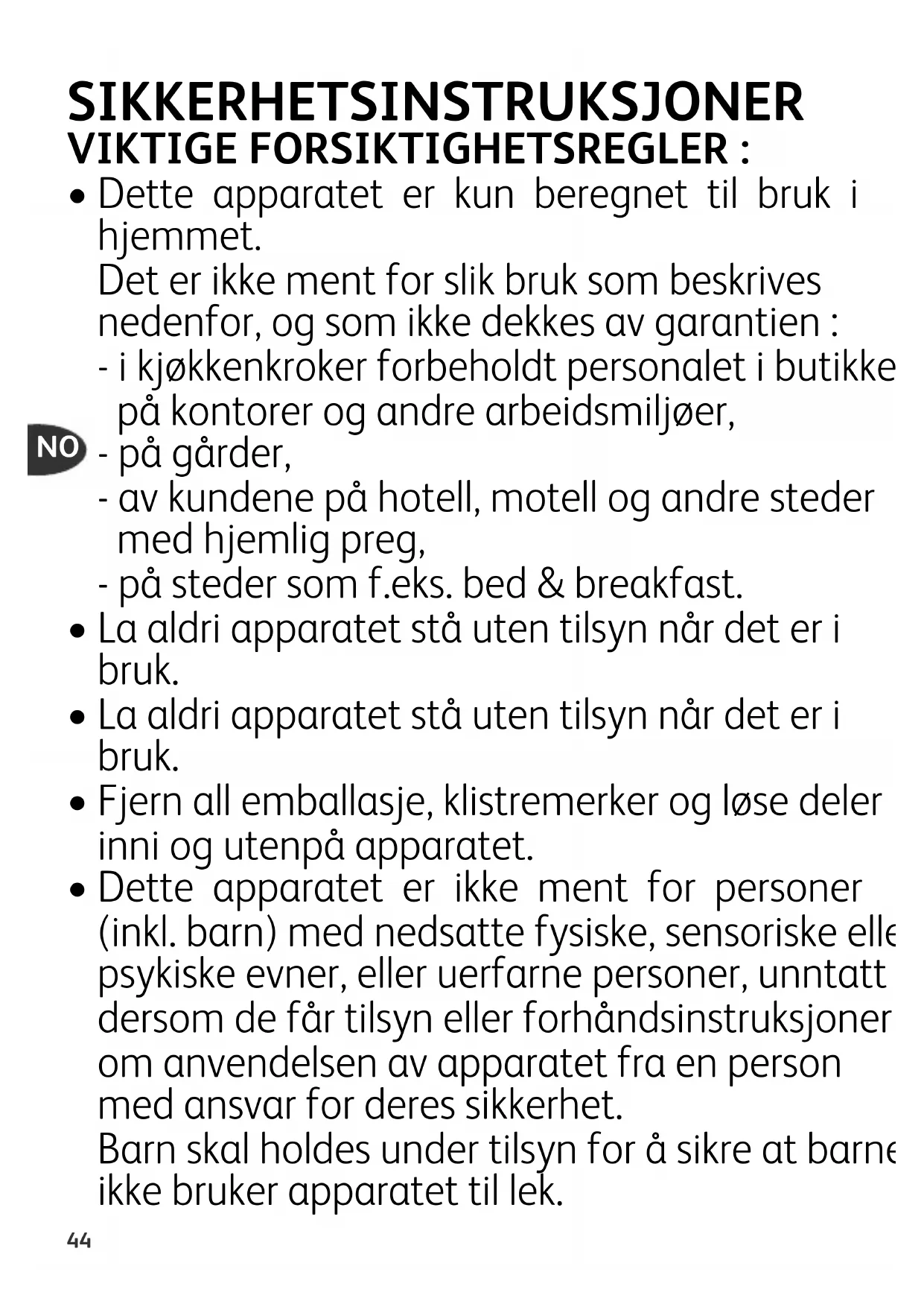 - Dette apparatet er ikke ment for personer (inkl. barn) med nedsatte fysiske, sensoriske eller psykiske evner, eller uerfarne personer, unntatt dersom de får tilsyn eller forhåndsinstruksjoner om anvendelsen av apparatet fra en person med ansvar for deres sikkerhet. Barn skal holdes under tilsyn for å sikre at barnet ikke bruker apparatet til lek.