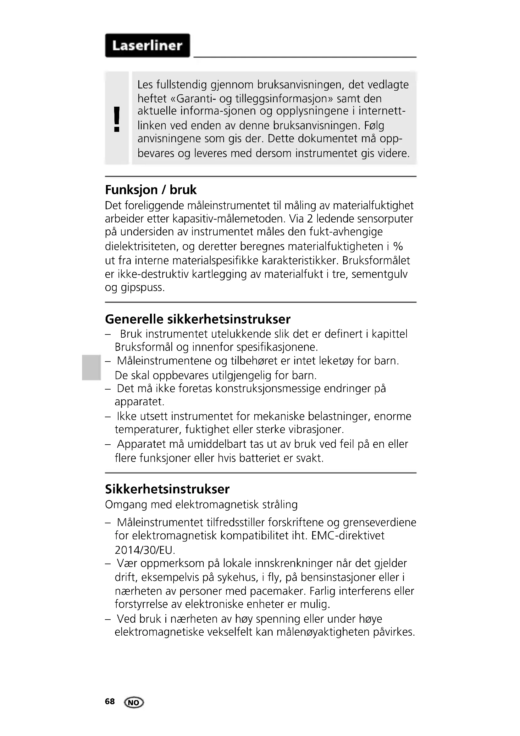 Generelle sikkerhetsinstrukser – Bruk instrumentet utelukkende slik det er denert i kapittel Bruksformål og innenfor spesikasjonene. – Måleinstrumentene og tilbehøret er intet leketøy for barn. De skal oppbevares utilgjengelig for barn. – Det må ikke foretas konstruksjonsmessige endringer på apparatet. – Ikke utsett instrumentet for mekaniske belastninger, enorme temperaturer, fuktighet eller sterke vibrasjoner. – Apparatet må umiddelbart tas ut av bruk ved feil på en eller ere funksjoner eller hvis batteriet er svakt. Sikkerhetsinstrukser Omgang med elektromagnetisk stråling – Måleinstrumentet tilfredsstiller forskriftene og grenseverdiene for elektromagnetisk kompatibilitet iht. EMC-direktivet 2014/30/EU. – Vær oppmerksom på lokale innskrenkninger når det gjelder drift, eksempelvis på sykehus, i y, på bensinstasjoner eller i nærheten av personer med pacemaker. Farlig interferens eller forstyrrelse av elektroniske enheter er mulig. – Ved bruk i nærheten av høy spenning eller under høye elektromagnetiske vekselfelt kan målenøyaktigheten påvirkes.MoistureFinder Compact