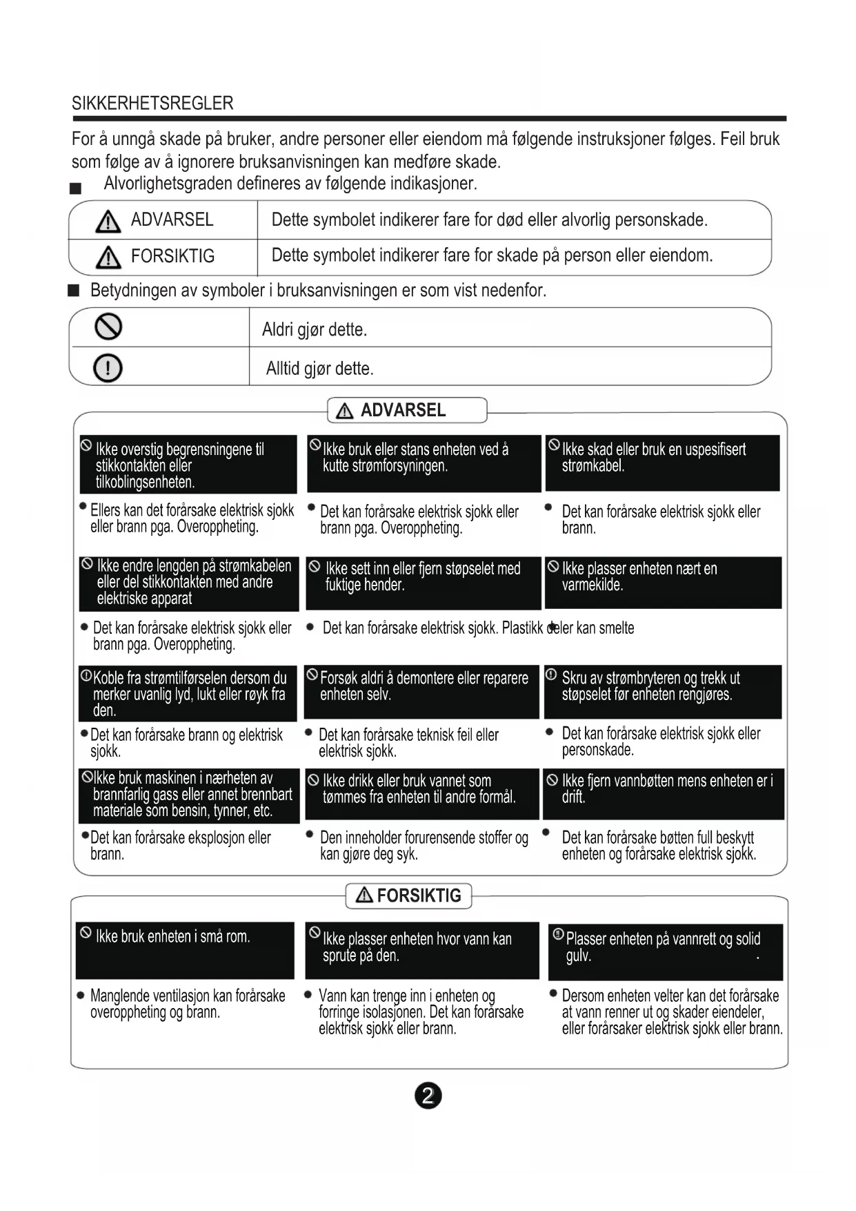 SIKKERHETSREGLER For å unngå skade på bruker, andre personer eller eiendom må følgende instruksjoner følges. Feil bruk som følge av å ignorere bruksanvisningen kan medføre skade. Alvorlighetsgraden defineres av følgende indikasjoner. Betydningen av symboler i bruksanvisningen er som vist nedenfor. ADVARSEL Aldri gjør dette. Alltid gjør dette. ADVARSEL FORSIKTIG Dette symbolet indikerer fare for død eller alvorlig personskade. FORSIKTIG Dette symbolet indikerer fare for skade på person eller eiendom. Ikke overstig begrensningene til stikkontakten eller tilkoblingsenheten. Ellers kan det forårsake elektrisk sjokk eller brann pga. Overoppheting. Det kan forårsake elektrisk sjokk eller brann pga. Overoppheting. Det kan forårsake elektrisk sjokk eller brann. Ikke bruk eller stans enheten ved å kutte strømforsyningen. Ikke skad eller bruk en uspesifisert strømkabel. Ikke endre lengden på strømkabelen eller del stikkontakten med andre elektriske apparat Det kan forårsake elektrisk sjokk eller brann pga. Overoppheting. Det kan forårsake elektrisk sjokk. Plastikk deler kan smelte Ikke sett inn eller fjern støpselet med fuktige hender. Ikke plasser enheten nært en varmekilde. Koble fra strømtilførselen dersom du merker uvanlig lyd, lukt eller røyk fra den. Det kan forårsake brann og elektrisk sjokk. Det kan forårsake teknisk feil eller elektrisk sjokk. Det kan forårsake elektrisk sjokk eller personskade. Forsøk aldri å demontere eller reparere enheten selv. Skru av strømbryteren og trekk ut støpselet før enheten rengjøres. Ikke bruk maskinen i nærheten av brannfarlig gass eller annet brennbart materiale som bensin, tynner, etc. Det kan forårsake eksplosjon eller brann. Den inneholder forurensende stoffer og kan gjøre deg syk. Det kan forårsake bøtten full beskytt enheten og forårsake elektrisk sjokk. Ikke drikk eller bruk vannet som tømmes fra enheten til andre formål. Ikke fjern vannbøtten mens enheten er i drift. Ikke bruk enheten i små rom. Manglende ventilasjon kan forårsake overoppheting og brann. Vann kan trenge inn i enheten og forringe isolasjonen. Det kan forårsake elektrisk sjokk eller brann. Dersom enheten velter kan det forårsake at vann renner ut og skader eiendeler, eller forårsaker elektrisk sjokk eller brann. Ikke plasser enheten hvor vann kan sprute på den. Plasser enheten på vannrett og solid gulv.3