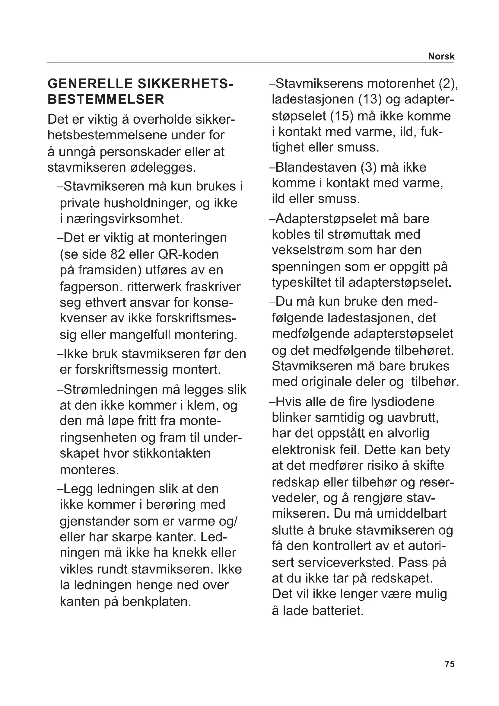 In de correcte positie zit de staafmixer voelbaar vast en knipperen de LED’s van de LED-indicatie (6). Nederlands75 GENERELLE SIKKERHETS- BESTEMMELSER Det er viktig å overholde sikker- hetsbestemmelsene under for å unngå personskader eller at stavmikseren ødelegges. – Stavmikseren må kun brukes i private husholdninger, og ikke i næringsvirksomhet. – Det er viktig at monteringen (se side 82 eller QR-koden på framsiden) utføres av en fagperson. ritterwerk fraskriver seg ethvert ansvar for konse- kvenser av ikke forskriftsmes- sig eller mangelfull montering. – Ikke bruk stavmikseren før den er forskriftsmessig montert. – Strømledningen må legges slik at den ikke kommer i klem, og den må løpe fritt fra monte- ringsenheten og fram til under- skapet hvor stikkontakten monteres. – Legg ledningen slik at den ikke kommer i berøring med gjenstander som er varme og/ eller har skarpe kanter. Led- ningen må ikke ha knekk eller vikles rundt stavmikseren. Ikke la ledningen henge ned over kanten på benkplaten. – Stavmikserens motorenhet (2), ladestasjonen (13) og adapter- støpselet (15) må ikke komme i kontakt med varme, ild, fuk- tighet eller smuss. – Blandestaven (3) må ikke komme i kontakt med varme, ild eller smuss. – Adapterstøpselet må bare kobles til strømuttak med vekselstrøm som har den spenningen som er oppgitt på typeskiltet til adapterstøpselet. – Du må kun bruke den med- følgende ladestasjonen, det medfølgende adapterstøpselet og det medfølgende tilbehøret. Stavmikseren må bare brukes med originale deler og tilbehør. – Hvis alle de re lysdiodene blinker samtidig og uavbrutt, har det oppstått en alvorlig elektronisk feil. Dette kan bety at det medfører risiko å skifte redskap eller tilbehør og reser- vedeler, og å rengjøre stav- mikseren. Du må umiddelbart slutte å bruke stavmikseren og få den kontrollert av et autori- sert serviceverksted. Pass på at du ikke tar på redskapet. Det vil ikke lenger være mulig å lade batteriet. Norsk76 – Stavmikseren må ikke brukes av barn. Stavmikseren og strømledningen må oppbeva- res utilgjengelig for barn. – Stavmikseren kan brukes av personer med nedsatte fysiske, sensoriske eller mentale evner, eller mangel på erfaring eller kunnskaper, hvis det skjer under tilsyn, eller de har fått opplæring i hvordan den brukes på en sikker måte, og de forstår farene som er forbundet med bruken. – Barn må ikke leke med stavmikseren. – Stavmikseren må kun brukes i beholdere med at bunn. – Stavmikseren må ikke senkes lenger ned i blandingen enn til overgangen mellom motoren- heten og blandestaven. – Gå aldri fra stavmikseren mens den er i bruk. – Senk aldri hele stavmikseren, ladestasjonen eller adap- terstøpselet ned i vann eller andre væsker. Stavmikseren må aldri utsettes for regn eller annen fuktighet. Hvis den like- vel skulle falle ned i vann, må du først ta adapterstøpselet til ladestasjonen ut av stikkon- takten, og deretter stavmik- serens deler opp av vannet. Stavmikserenmå i slike tilfeller kontrolleres av et autorisert serviceverksted før den tas i bruk igjen. – Ikke bruk stavmikseren når du er fuktig på hendene. Ikke bruk stavmikseren hvis den er fuktig eller vått, eller hvis du står på et fuktig underlag. Stavmikseren må ikke brukes utendørs. – Stavmikseren og ladesta- sjonen skal ikke rengjøres i oppvaskmaskin. – Ikke berør redskapene og ikke stikk gjenstander inn i stavmik- seren når den er i bruk. Norsk77 Fare for personskader – Hvis det oppstår driftsproble- mer med ladestasjonen, må du straks dra ut adapterstøp- selet fra stikkontakten. Trekk alltid ut selve støpselet uten å dra i ledningen. – For å unngå farlige situa- sjoner må du slutte å bruke stavmiks eren umiddelbart hvis deler er ødelagt eller skadet. Stavmikserenmå i slike tilfeller kontrolleres av et autorisert serviceverksted før den tas i bruk igjen. – Et skadet adapterstøpsel eller en skadet strømledning skal erstattes av et originalt adapterstøpsel som skaes til veie fra produsenten, eller av kundeservice i landet hvor det er kjøpt. – Stavmikseren må aldri slås på når den rengjøres, når red- skaper tas av eller settes på, eller mens det byttes tilbehør eller reservedeler. Pass derfor på at ngrene ikke berører knappene. Ikke berør bladene på redskapene; de er meget skarpe. Norsk – Det kan sprute av matvarer som bearbeides. La derfor varme matvarer kjøle ned før de bearbeides, for å unngå forbrenninger. – Trekk kasserollen av platen når du bruker stavmikseren i en kasserolle. – Pass på at hakket i redska- pene er godt festet i låsetap- pen på drivakselen. Redska- per som er løse og ikke sitter godt, må ikke brukes og skal byttes ut. Eksplosjonsfare – Ikke la batteriene komme i nærheten av varme og ild.78 Fold ut illustrasjonene foran og bak i heftet. Les bruksanvisningen nøye før du tar stavmikseren i bruk. Oppbevar bruksanvisningen på et trygt sted. Den hører til stavmikseren, og skal følge med til eventuell ny bruker. Du nner også den aktuelle bruksanvisningen på www.ritterwerk.de. BRUKSOMRÅDE Med stavmikseren kan du hakke, lage puré og røre sammen alle typer matvarer som egner seg. Stavmikseren er egnet for kontakt med matvarer. Stavmikseren må kun brukes i private husholdninger, og ikke i næringsvirksomhet. Ikke forskriftsmessig bruk eller feilbetjening kan føre til alvorlige personskader og/eller ødelegge stavmikseren. Alle garanti- og ansvarskrav vil da bortfalle. STAVMIKSERENS FUNKSJONER Med den batteridrevne stavmik- seren kan du hakke, lage puré og røre sammen både faste og ytende matvarer. Stavmikseren (1) leveres med en blandebolle (14) i plast og følgende redskaper: – Universalkutter(9): standard- redskap som kutter og lager puré av de este matvarer – Kutter (10): til hakking av kjøtt og grove grønnsaker og frukter – Visp (11): til luftig pisking av matvarer, f.eks. kremøte – Elte