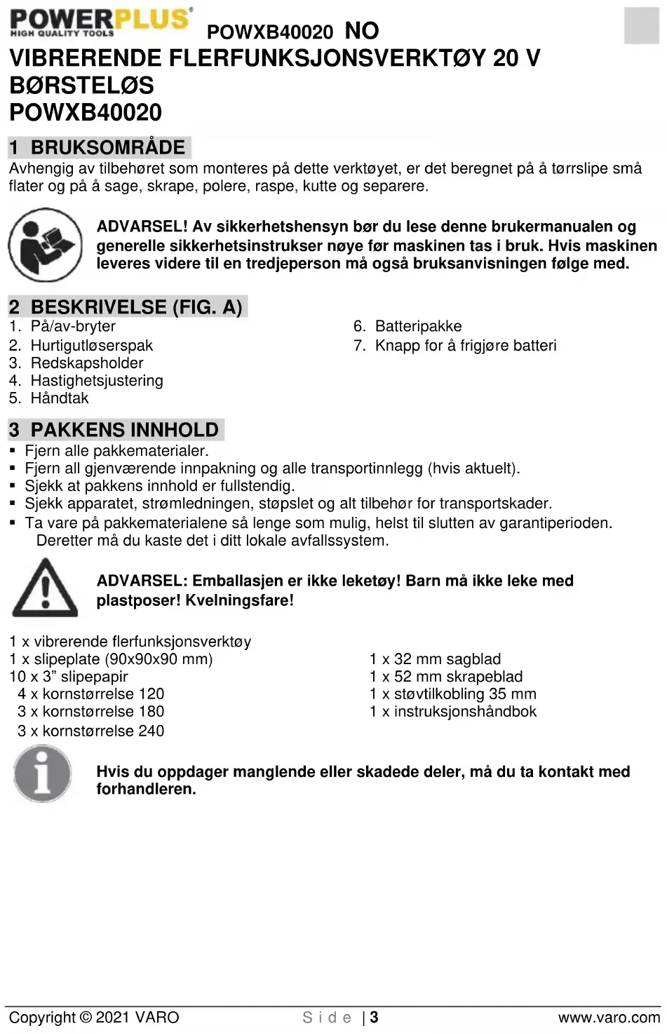 Turtall uten belastning 12 000-19 500 min-1 12 STØY Støyemisjonsverdier målt i samsvar med relevant standard. (K=3) Lydtrykknivå LpA 82 dB(A) Lydeffektnivå LwA 93 dB(A) VIKTIG! Bruk hørselsvern når lydtrykket er over 85 dB(A). Vibrasjon aw 4,4 m/s² K = 1,5 m/s²POWXB40020 NO Copyright © 2021 VARO S i d e | 12 www.varo.com 13 GARANTI