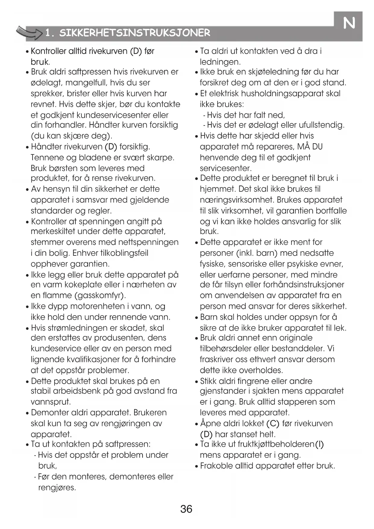 - Ta ut kontakten på saftpressen: - Hvis det oppstår et problem under bruk, - Før den monteres, demonteres eller rengjøres.