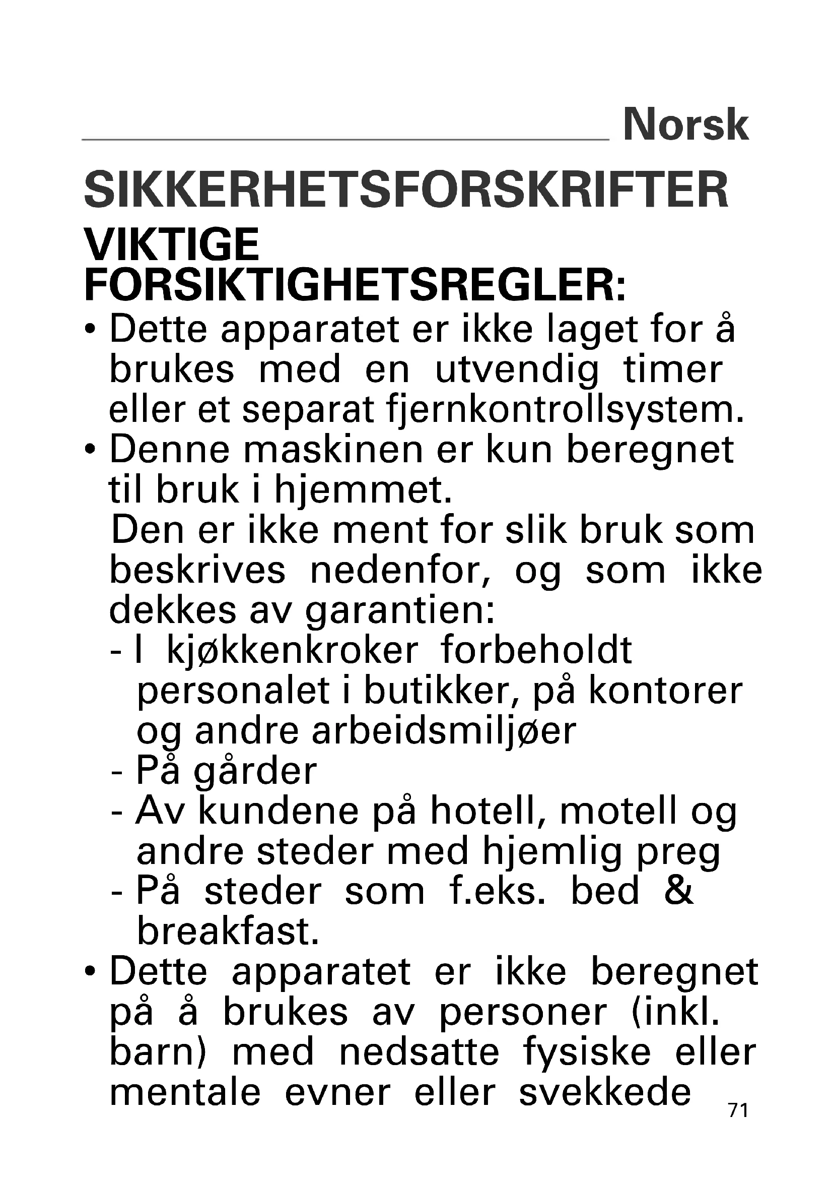 - Denne maskinen er kun beregnet til bruk i hjemmet. Den er ikke ment for slik bruk som beskrives nedenfor, og som ikke dekkes av garantien: - I kjøkkenkroker forbeholdt personalet i butikker, på kontorer og andre arbeidsmiljøer - På gårder - Av kundene på hotell, motell og andre steder med hjemlig preg - På steder som f.eks. bed & breakfast.