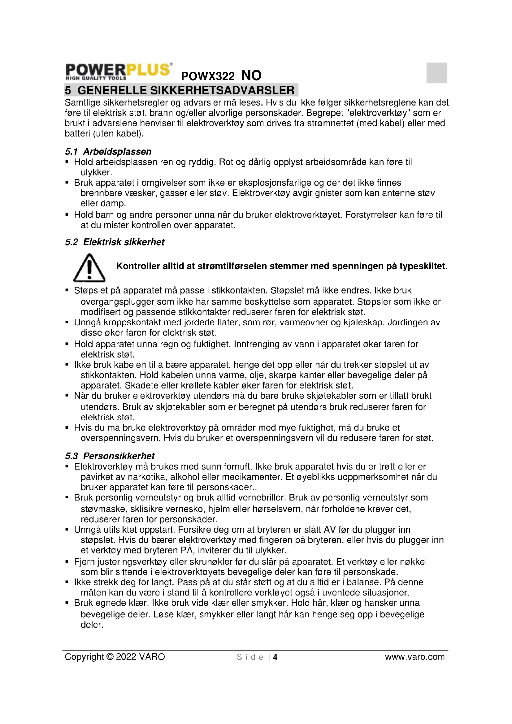 - Bruk egnede klær. Ikke bruk vide klær eller smykker. Hold hår, klær og hansker unna bevegelige deler. Løse klær, smykker eller langt hår kan henge seg opp i bevegelige deler.POWX322 NO Copyright © 2022 VARO S i d e | 5 www.varo.com