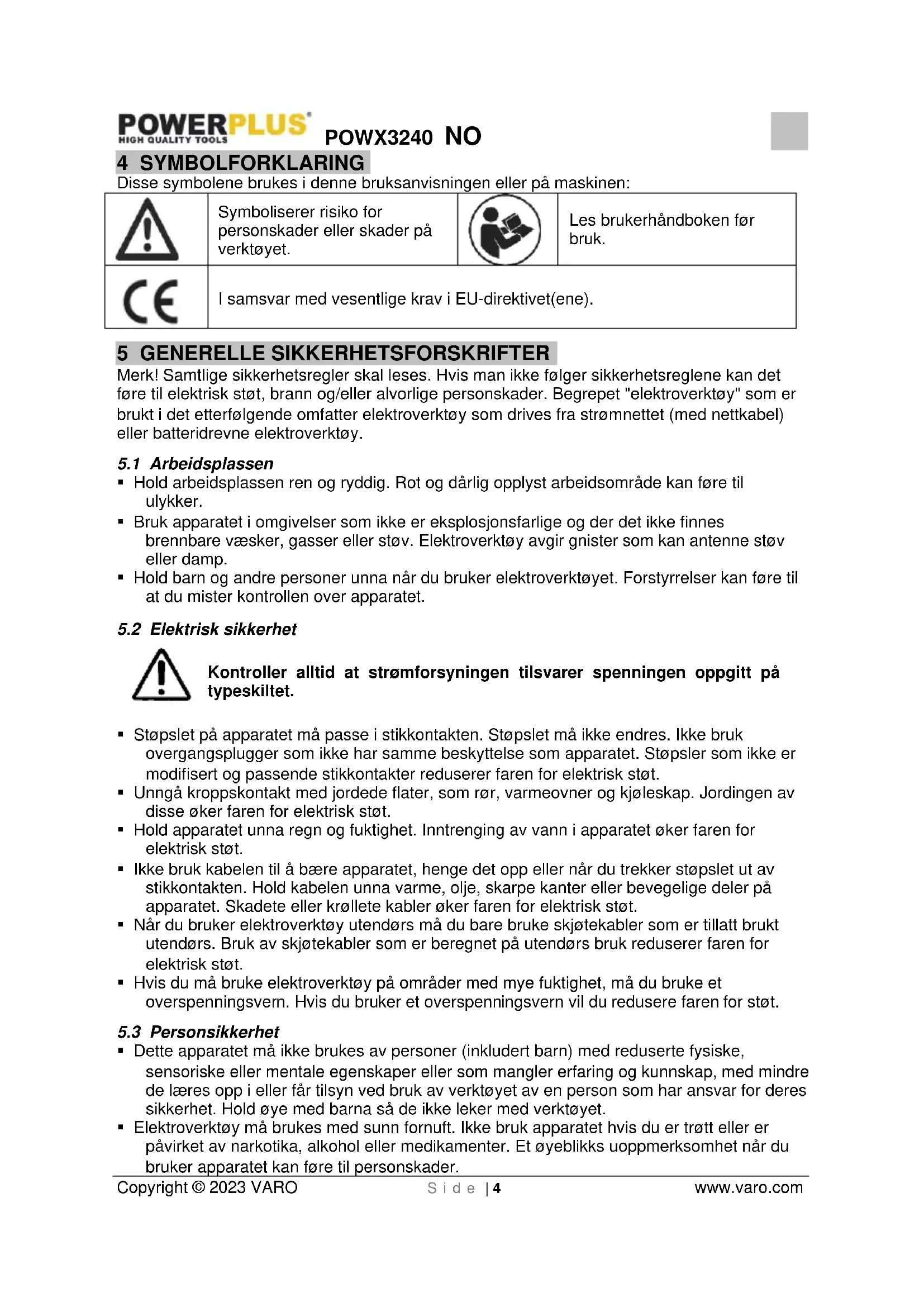 - Hvis du bruker skjøteledning, må den være av vanntett type.POWX3240 NO Copyright © 2023 VARO S i d e | 6 www.varo.com