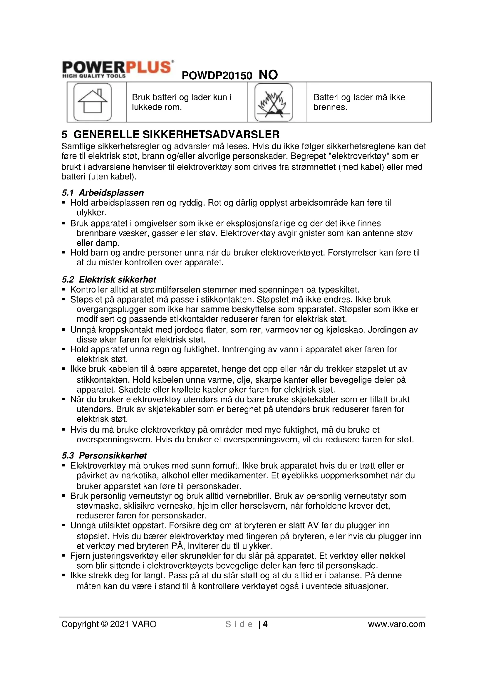 - Følg alle ladeinstruksjonene og unngå å lade batteripakken eller verktøyet på et sted med temperatur utenfor temperaturområdet som er spesifisert i instruksjonene. Feil lading eller lading i temperatur utenfor det spesifiserte området, kan skade batteriet og øke brannfaren.POWDP20150 NO Copyright © 2021 VARO S i d e | 6 www.varo.com