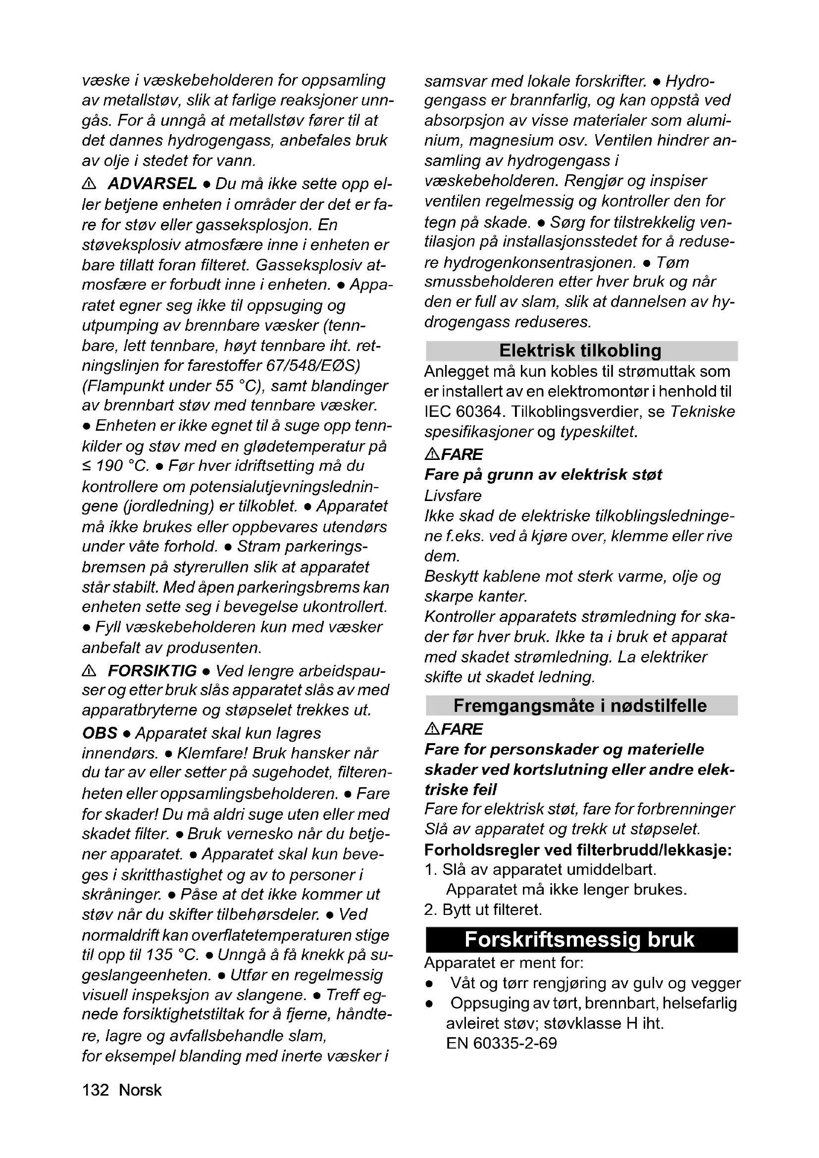 - EU-samsvarserklæring 32 Norsk væske i væskebeholderen for oppsamling av metallstøv, slik at farlige reaksjoner unn- gås. For å unngå at metallstøv fører til at det dannes hydrogengass, anbefales bruk av olje i stedet for vann. 몇 ADVARSEL ● Du må ikke sette opp el- ler betjene enheten i områder der det er fa- re for støv eller gasseksplosjon. En støveksplosiv atmosfære inne i enheten er bare tillatt foran filteret. Gasseksplosiv at- mosfære er forbudt inne i enheten. ● Appa- ratet egner seg ikke til oppsuging og utpumping av brennbare væsker (tenn- bare, lett tennbare, høyt tennbare iht. ret- ningslinjen for farestoffer 67/548/EØS) (Flampunkt under 55 °C), samt blandinger av brennbart støv med tennbare væsker. ● Enheten er ikke egnet til å suge opp tenn- kilder og støv med en glødetemperatur på ≤ 190 °C. ● Før hver idriftsetting må du kontrollere om potensialutjevningslednin- gene (jordledning) er tilkoblet. ● Apparatet må ikke brukes eller oppbevares utendørs under våte forhold. ● Stram parkerings- bremsen på styrerullen slik at apparatet står stabilt. Med åpen parkeringsbrems kan enheten sette seg i bevegelse ukontrollert. ● Fyll væskebeholderen kun med væsker anbefalt av produsenten. 몇 FORSIKTIG ● Ved lengre arbeidspau- ser og etter bruk slås apparatet slås av med apparatbryterne og støpselet trekkes ut. OBS ● Apparatet skal kun lagres innendørs. ● Klemfare! Bruk hansker når du tar av eller setter på sugehodet, filteren- heten eller oppsamlingsbeholderen. ● Fare for skader! Du må aldri suge uten eller med skadet filter. ● Bruk vernesko når du betje- ner apparatet. ● Apparatet skal kun beve- ges i skritthastighet og av to personer i skråninger. ● Påse at det ikke kommer ut støv når du skifter tilbehørsdeler. ● Ved normaldrift kan overflatetemperaturen stige til opp til 135 °C. ● Unngå å få knekk på su- geslangeenheten. ● Utfør en regelmessig visuell inspeksjon av slangene. ● Treff eg- nede forsiktighetstiltak for å fjerne, håndte- re, lagre og avfallsbehandle slam, for eksempel blanding med inerte væsker i samsvar med lokale forskrifter. ● Hydro- gengass er brannfarlig, og kan oppstå ved absorpsjon av visse materialer som alumi- nium, magnesium osv. Ventilen hindrer an- samling av hydrogengass i væskebeholderen. Rengjør og inspiser ventilen regelmessig og kontroller den for tegn på skade. ● Sørg for tilstrekkelig ven- tilasjon på installasjonsstedet for å reduse- re hydrogenkonsentrasjonen. ● Tøm smussbeholderen etter hver bruk og når den er full av slam, slik at dannelsen av hy- drogengass reduseres. Elektrisk tilkobling Anlegget må kun kobles til strømuttak som er installert av en elektromontør i henhold til IEC 60364. Tilkoblingsverdier, se Tekniske spesifikasjoner og typeskiltet. FARE Fare på grunn av elektrisk støt Livsfare Ikke skad de elektriske tilkoblingsledninge- ne f.eks. ved å kjøre over, klemme eller rive dem. Beskytt kablene mot sterk varme, olje og skarpe kanter. Kontroller apparatets strømledning for ska- der før hver bruk. Ikke ta i bruk et apparat med skadet strømledning. La elektriker skifte ut skadet ledning. Fremgangsmåte i nødstilfelle FARE Fare for personskader og materielle skader ved kortslutning eller andre elek- triske feil Fare for elektrisk støt, fare for forbrenninger Slå av apparatet og trekk ut støpselet. Forholdsregler ved filterbrudd/lekkasje: p. 1421