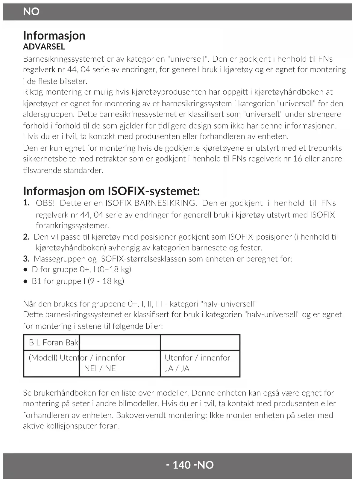 Informasjon ADVARSEL Barnesikringssystemet er av kategorien "universell". Den er godkjent i henhold l FNs regelverk nr 44, 04 serie av endringer, for generell bruk i kjøretøy og er egnet for montering i de este bilseter. Rikg montering er mulig hvis kjøretøyprodusenten har oppgi i kjøretøyhåndboken at kjøretøyet er egnet for montering av et barnesikringssystem i kategorien "universell" for den aldersgruppen. Dee barnesikringssystemet er klassisert som "universelt" under strengere forhold i forhold l de som gjelder for dligere design som ikke har denne informasjonen. Hvis du er i tvil, ta kontakt med produsenten eller forhandleren av enheten. Den er kun egnet for montering hvis de godkjente kjøretøyene er utstyrt med et trepunkts sikkerhetsbelte med retraktor som er godkjent i henhold l FNs regelverk nr 16 eller andre lsvarende standarder. Informasjon om ISOFIX-systemet: