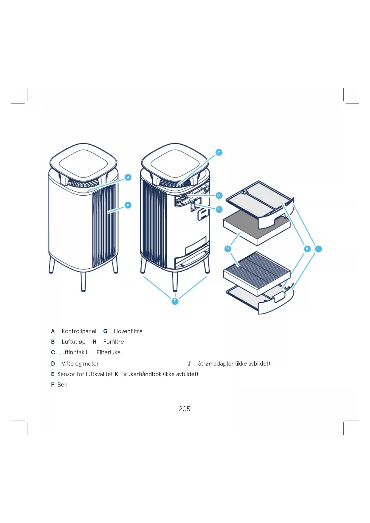 A Kontrollpanel G Hovedfiltre B Luftutløp H Forfiltre C Luftinntak I Filterluke D Vifte og motor J Strømadapter (ikke avbildet) E Sensor for luftkvalitet K Brukerhåndbok (ikke avbildet) F Ben206 Sikkerhetsinstruksjoner Blueair DustMagnet
