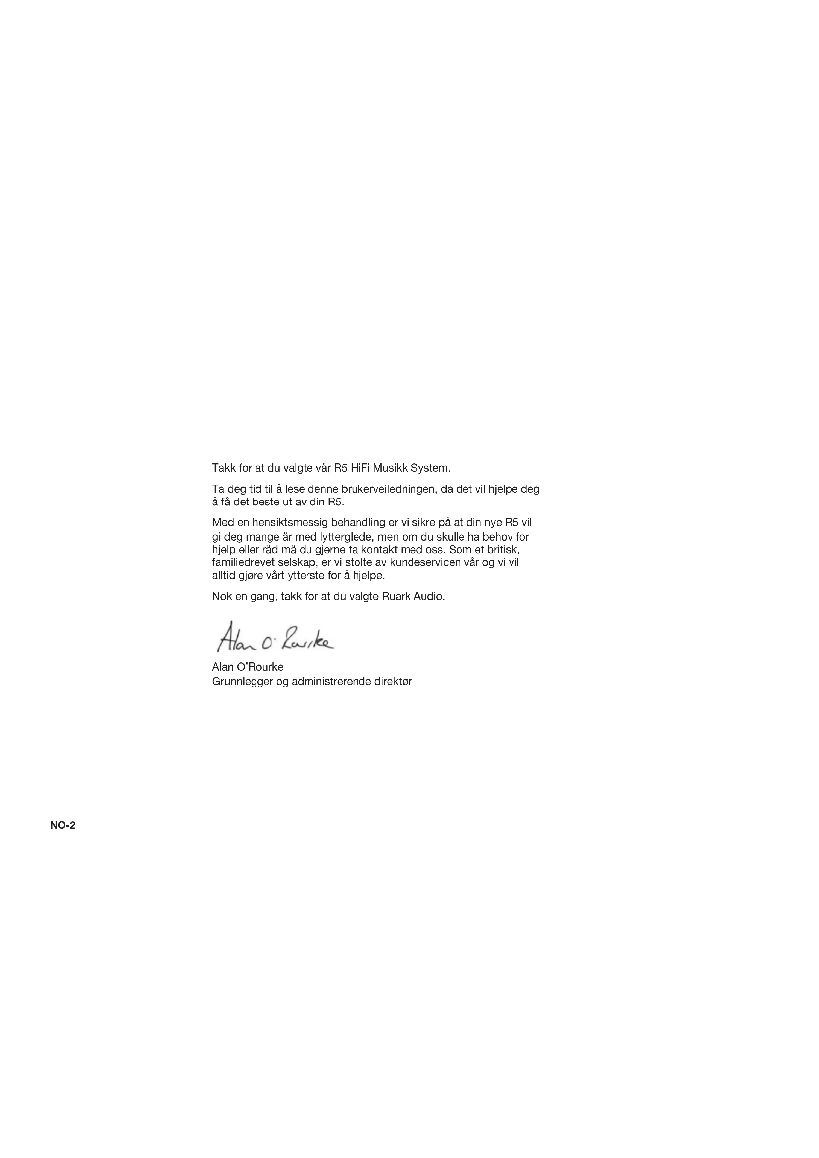 KRNO-2 Takk for at du valgte vår R5 HiFi Musikk System. Ta deg tid til å lese denne brukerveiledningen, da det vil hjelpe deg å få det beste ut av din R5. Med en hensiktsmessig behandling er vi sikre på at din nye R5 vil gi deg mange år med lytterglede, men om du skulle ha behov for hjelp eller råd må du gjerne ta kontakt med oss. Som et britisk, familiedrevet selskap, er vi stolte av kundeservicen vår og vi vil alltid gjøre vårt ytterste for å hjelpe. Nok en gang, takk for at du valgte Ruark Audio. Alan O’Rourke Grunnlegger og administrerende direktørNO-3