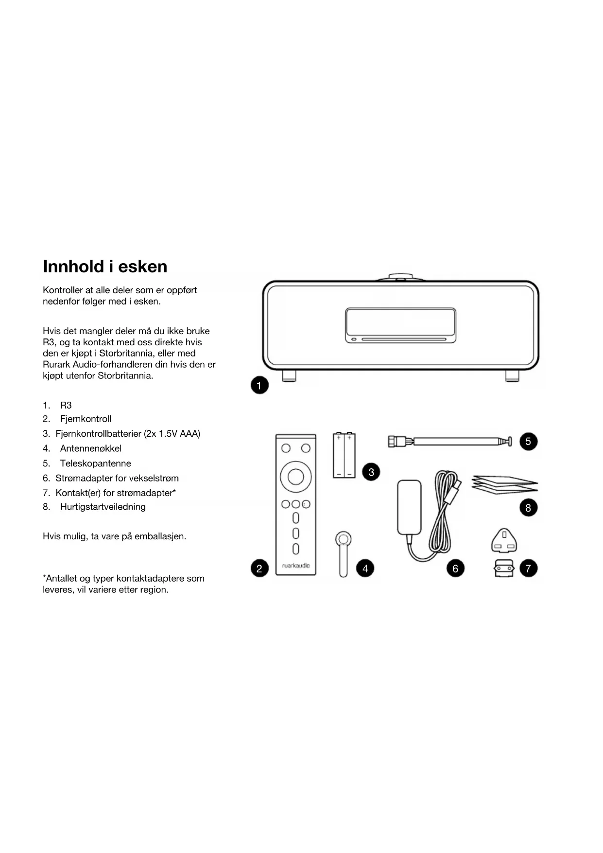 Dette apparatet er i samsvar med alle lovbestemte krav i EU-direktiver. Herved erklærer Ruark Audio at denne enheten overholder de viktigste kravene og andre relevante bestemmelser i det europeiske direktiv om radioutstyr 2014/53/EU. Du kan laste ned den fullstendige CE-samsvarserklæringen på www.ruarkaudio.com/doc/R3doc.pdfNO Spesifikasjoner Forsterkere og drivere 2 × 75mm Ruark NS+ høyttalere 30W klase AB effektforsterker Forbedret digital 3D-lydprosessor Radio DAB, DAB+ og FM-radio med RDS 75 Ohm F-type DAB/FM antenne-inngang CD spiller CD, CD-ROM, CD-R/RW disker MP3, WMA, AAC 320kbps Digital lyd Audiol 32-bit 112dB lydstereo DAC Internett radio, Spotify Connect, Amazon Music, Deezer, TIDAL, UPnP™ DLNA Wi-Fi 802.11b/g/n støtter WEP, WPA & WPA2 sikkerhet MP3 48kHz 320kbps, AAC 96kHz 320kbps, FLAC 24-bit 48kHz, WAV 16-bit 48kHz / 24 bit 44.1kHz, WMA 44.1kHz 320kbps Bluetooth: SBC, AAC, A2DP, aptX Innganger og utganger Digital optiske (TOSLINK) 24-bit 192kHz Linje innganger (RCA) 2.3Vrms Line linje utganger(RCA) 2.0Vrms Ethernet (RJ45) USB 2.0, 5W (5V 1A) 3.5mm jack hodetelefon utgang, 25mW 16-32 Ohm Strømtilførsel Inngangseffekt 100-240VAC 50-60Hz 1A Utgangseffekt 14VDC 2.85A Nominelt forbruk 5W Standby forbruk: 1.6W Remote batteries: 2 x 1.5V AAA Fysiske H167 x B420 x D220mm 5.3kg Spesikasjon og design kan endres uten forvarsel. Ruark Audio påtar seg intet ansvar for eventuelle feil som måtte forekomme i denne bruksanvisningen, og informasjonen i den kan endres uten ytterligere varsel. Feilsøking Hvis du trenger hjelp med produktet, kan du se i FAQ (Ofte stilte spørsmål)-siden under supportområdet på nettsiden vår. For mer informasjon, se www.ruarkaudio.com/supportInnhold i esken Kontroller at alle deler som er oppført nedenfor følger med i esken. Hvis det mangler deler må du ikke bruke R3, og ta kontakt med oss direkte hvis den er kjøpt i Storbritannia, eller med Rurark Audio-forhandleren din hvis den er kjøpt utenfor Storbritannia.
