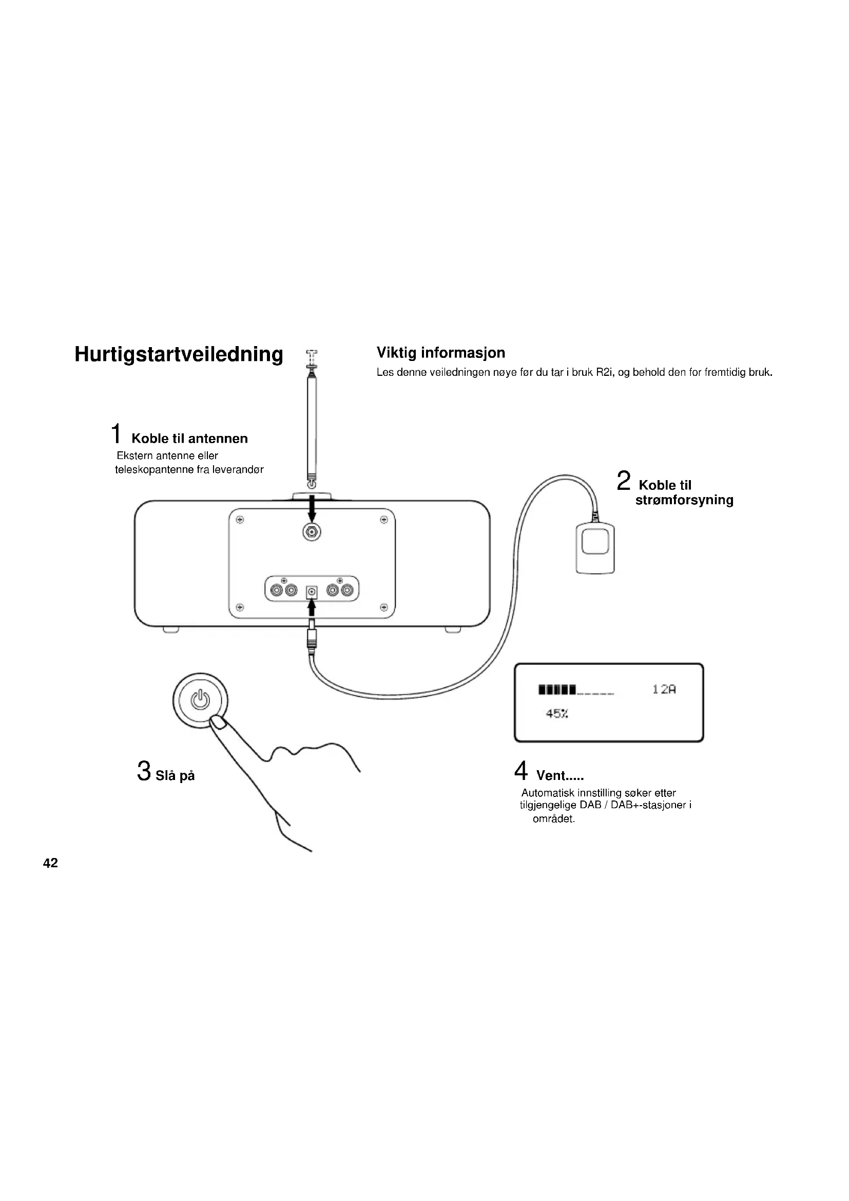 NL42 Hurtigstartveiledning Viktig informasjon Les denne veiledningen nøye før du tar i bruk R2i, og behold den for fremtidig bruk. 1 Koble til antennen Ekstern antenne eller teleskopantenne fra leverandør 2 Koble til strømforsyning 3 Slå på 4 Vent..... Automatisk innstilling søker etter tilgjengelige DAB / DAB+-stasjoner i området.43 5 Aktiver fjernkontrollen Fjern plasten for å aktivere batteriet ..... for radio DAB: trykk på ▼▲ for å bla gjennom tilgjengelige stasjoner. Trykk på OK for å velge stasjon. FM: trykk og hold nede ▼▲ for å søke etter neste tilgjengelige stasjon. ..... for MP3 og annet lydutstyr Koble til den analoge audioutgangen fra et eksternt lydutstyr som MP3, bærbar PC eller bærbar CD- spiller til aux-inngangen foran eller bak på R2i. 6 Lytt..... Velg først valgte kilde ..... for iPod For tilkobling av iPod, fjern støvdekslet og sett inn riktig adapter. R2i leveres med ere adaptere som passer til tidligere iPod-modeller. Senere iPod-modeller leveres vanligvis med et adapter som p