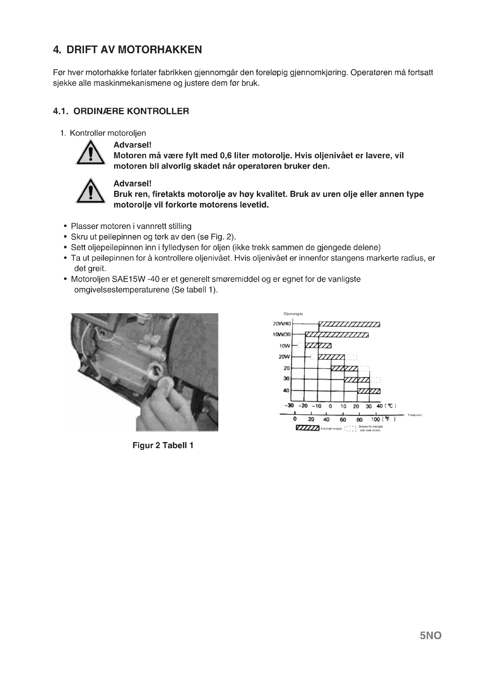 - Motoroljen SAE15W -40 er et generelt smøremiddel og er egnet for de vanligste omgivelsestemperaturene (Se tabell 1). Oljemengde Anbefalt mengde Grense for mengde som skal brukes Temperatur Figur 2 Tabell 16 NO