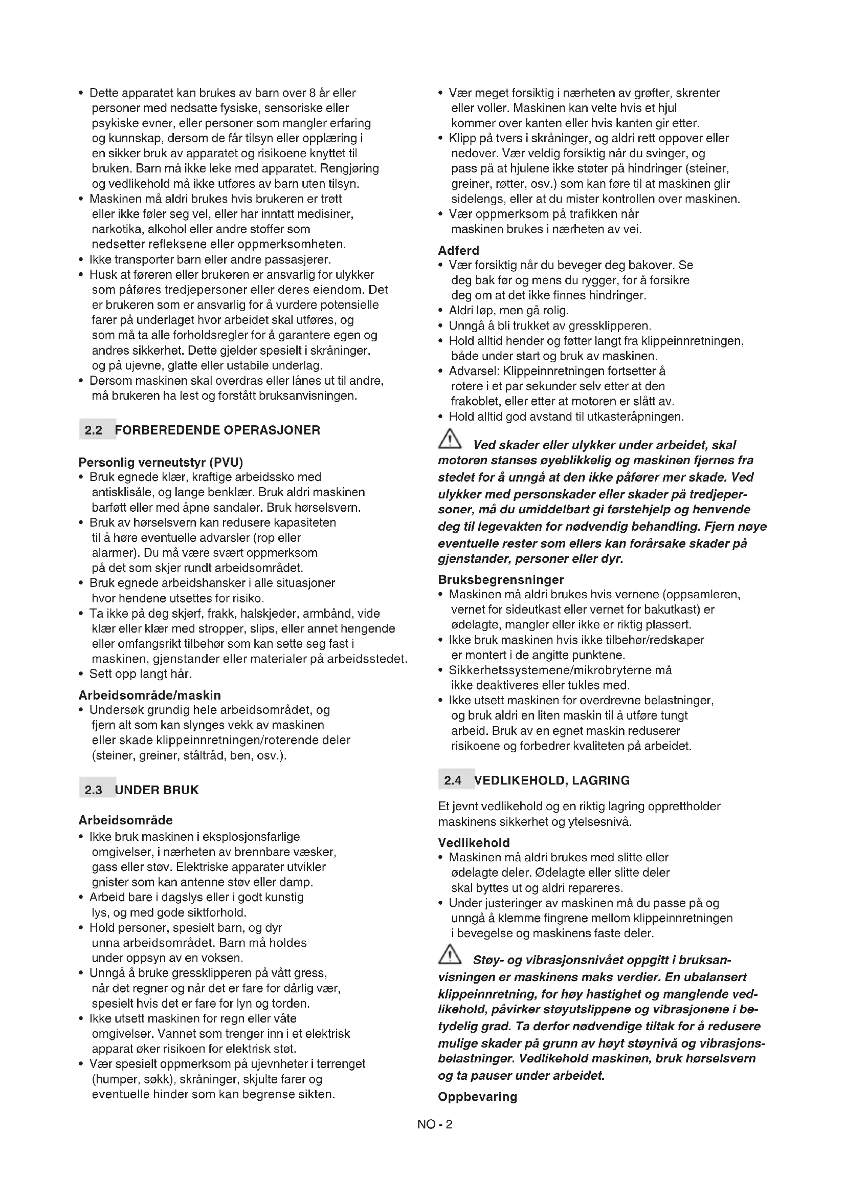 - Under justeringer av maskinen må du passe på og unngå å klemme ngrene mellom klippeinnretningen i bevegelse og maskinens faste deler. Støy- og vibrasjonsnivået oppgitt i bruksan- visningen er maskinens maks verdier. En ubalansert klippeinnretning, for høy hastighet og manglende ved- likehold, påvirker støyutslippene og vibrasjonene i be- tydelig grad. Ta derfor nødvendige tiltak for å redusere mulige skader på grunn av høyt støynivå og vibrasjons- belastninger. Vedlikehold maskinen, bruk hørselsvern og ta pauser under arbeidet. OppbevaringNO - 3