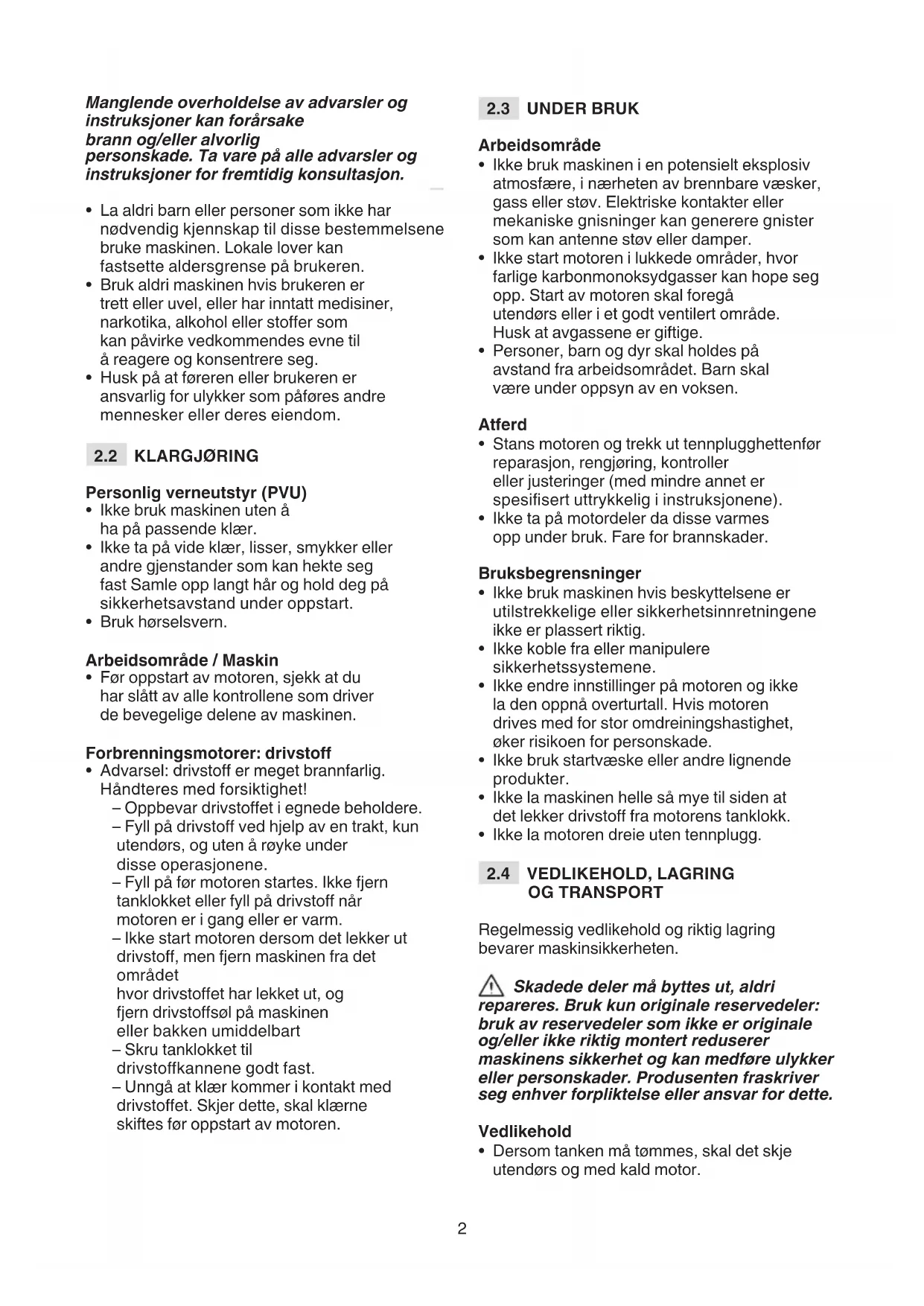 - Advarsel: drivsto er meget brannfarlig. Håndteres med forsiktighet! – Oppbevar drivstoet i egnede beholdere. – Fyll på drivsto ved hjelp av en trakt, kun utendørs, og uten å røyke under disse operasjonene. – Fyll på før motoren startes. Ikke fjern tanklokket eller fyll på drivsto når motoren er i gang eller er varm. – Ikke start motoren dersom det lekker ut drivsto, men fjern maskinen fra det området hvor drivstoet har lekket ut, og fjern drivstosøl på maskinen eller bakken umiddelbart – Skru tanklokket til drivstokannene godt fast. – Unngå at klær kommer i kontakt med drivstoet. Skjer dette, skal klærne skiftes før oppstart av motoren.