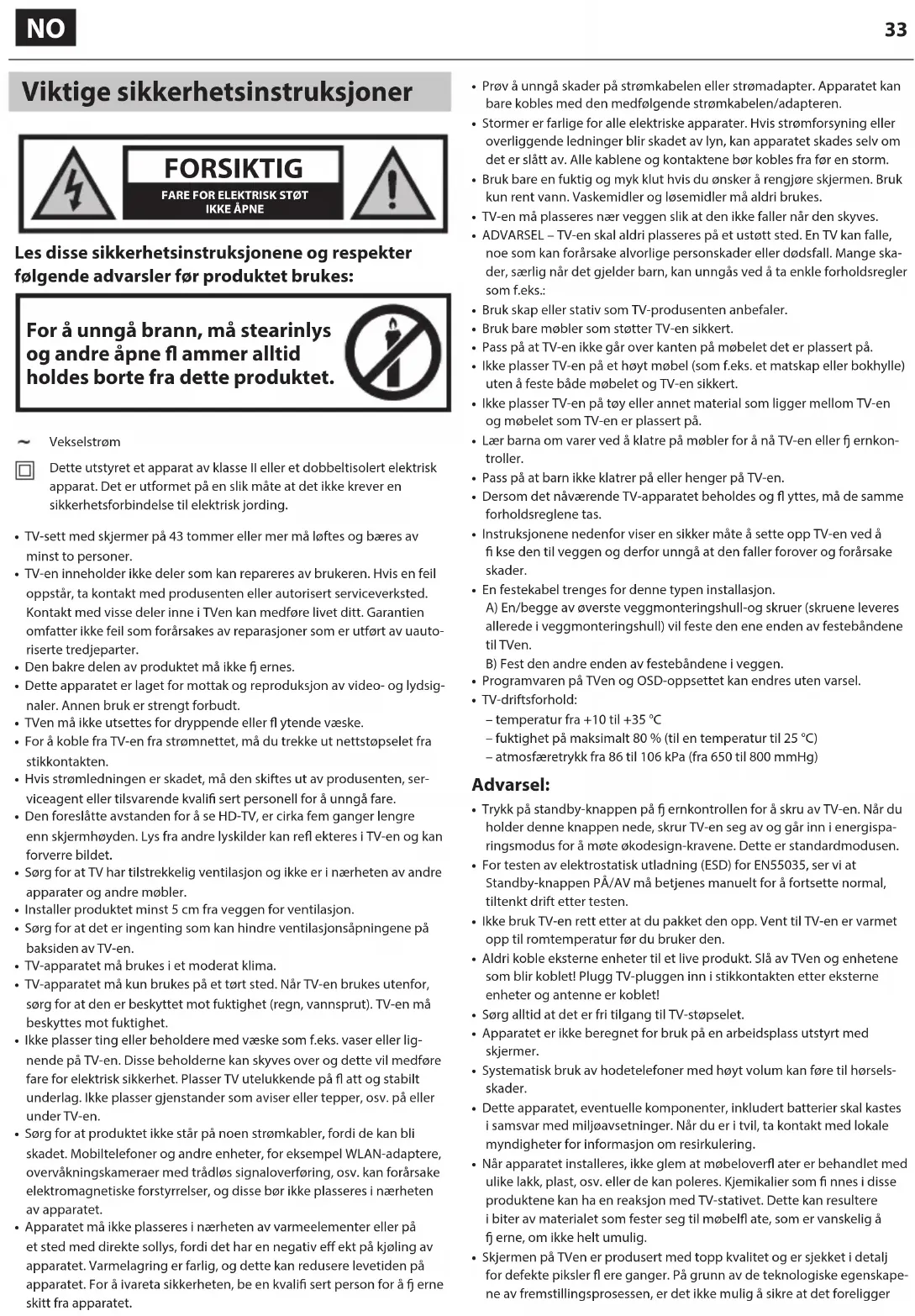- ADVARSEL – TV-en skal aldri plasseres på et ustøtt sted. En TV kan falle, noe som kan forårsake alvorlige personskader eller dødsfall. Mange ska- der, særlig når det gjelder barn, kan unngås ved å ta enkle forholdsregler som f.eks.: