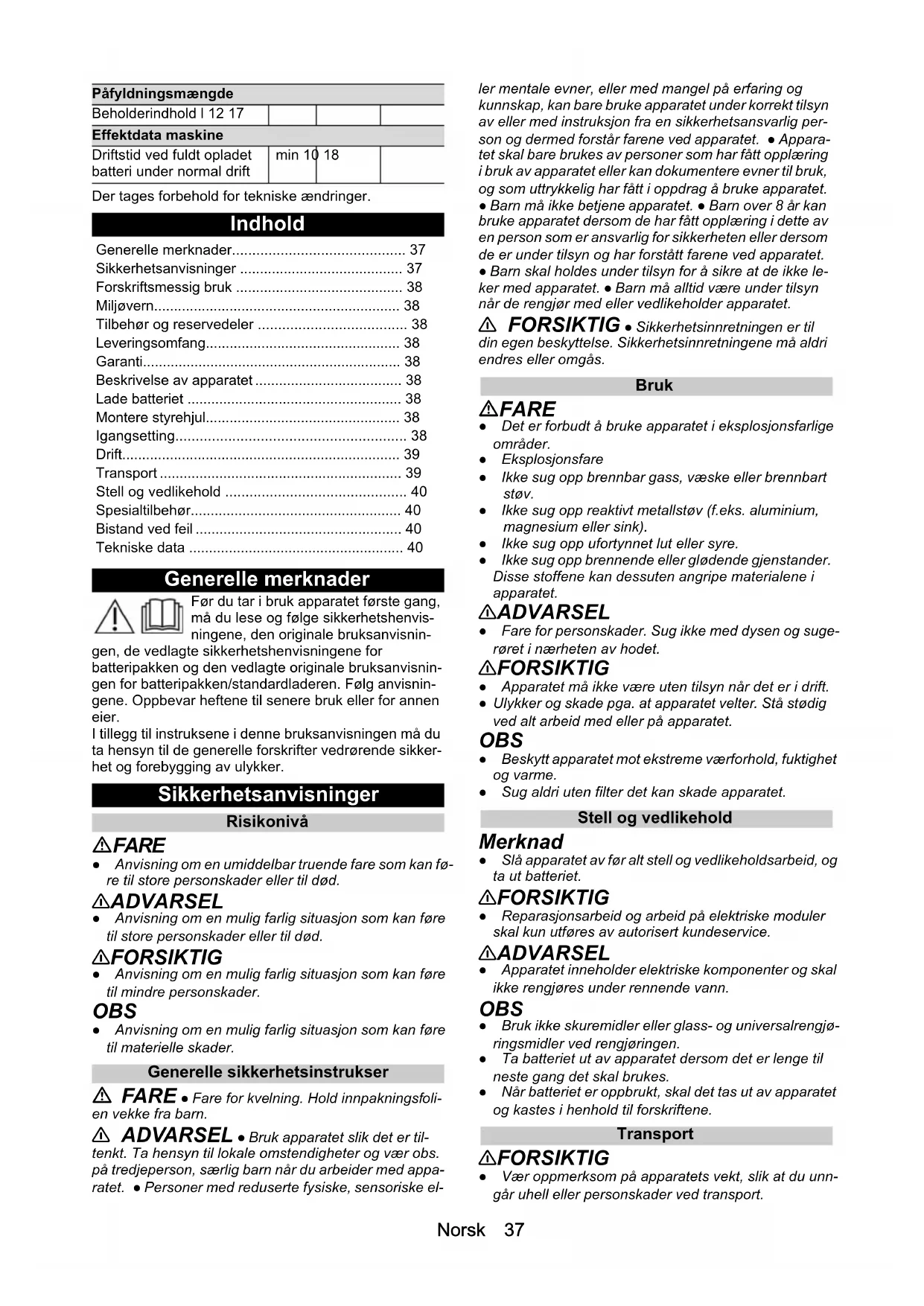 - Maskinen stopper pludseligt Maskine / batteripakke overophedet. Vent, til maskinen / batteripakken er kølet af. Reduceret sugekraft Tilbehøret, sugeslangen eller stængerne er tilstoppede. Fjern tilstopningen med et egnet hjælpemiddel. Filterposen er fuld. Udskift filterposen. Skumplastfilteret / patronfilteret er snavset. Rengør skumplastfilteret / patronfilteret (se kapitlet Rengøring af skumplastfilter / patronfilter). Skumplastfilteret / patronfilteret er beskadiget. Udskift skumplastfilteret / patronfilteret. Tekniske data WD 2-18 WD 3-18 Elektrisk tilslutning Kapslingsklasse IPX4 IPX4 Beskyttelsesklasse III III Batterispænding V 18 18 Nominel effekt W 245 245Norsk 37 Der tages forbehold for tekniske ændringer. Indhold Generelle merknader Før du tar i bruk apparatet første gang, må du lese og følge sikkerhetshenvis- ningene, den originale bruksanvisnin- gen, de vedlagte sikkerhetshenvisningene for batteripakken og den vedlagte originale bruksanvisnin- gen for batteripakken/standardladeren. Følg anvisnin- gene. Oppbevar heftene til senere bruk eller for annen eier. I tillegg til instruksene i denne bruksanvisningen må du ta hensyn til de generelle forskrifter vedrørende sikker- het og forebygging av ulykker. Sikkerhetsanvisninger Risikonivå FARE ● Anvisning om en umiddelbar truende fare som kan fø- re til store personskader eller til død. 몇 ADVARSEL ● Anvisning om en mulig farlig situasjon som kan føre til store personskader eller til død. 몇 FORSIKTIG ● Anvisning om en mulig farlig situasjon som kan føre til mindre personskader. OBS ● Anvisning om en mulig farlig situasjon som kan føre til materielle skader. Generelle sikkerhetsinstrukser FARE ● Fare for kvelning. Hold innpakningsfoli- en vekke fra barn. 몇 ADVARSEL ● Bruk apparatet slik det er til- tenkt. Ta hensyn til lokale omstendigheter og vær obs. på tredjeperson, særlig barn når du arbeider med appa- ratet. ● Personer med reduserte fysiske, sensoriske el- ler mentale evner, eller med mangel på erfaring og kunnskap, kan bare bruke apparatet under korrekt tilsyn av eller med instruksjon fra en sikkerhetsansvarlig per- son og dermed forstår farene ved apparatet. ● Appara- tet skal bare brukes av personer som har fått opplæring i bruk av apparatet eller kan dokumentere evner til bruk, og som uttrykkelig har fått i oppdrag å bruke apparatet. ● Barn må ikke betjene apparatet. ● Barn over 8 år kan bruke apparatet dersom de har fått opplæring i dette av en person som er ansvarlig for sikkerheten eller dersom de er under tilsyn og har forstått farene ved apparatet. ● Barn skal holdes under tilsyn for å sikre at de ikke le- ker med apparatet. ● Barn må alltid være under tilsyn når de rengjør med eller vedlikeholder apparatet. 몇 FORSIKTIG ● Sikkerhetsinnretningen er til din egen beskyttelse. Sikkerhetsinnretningene må aldri endres eller omgås. Bruk FARE ● Det er forbudt å bruke apparatet i eksplosjonsfarlige områder. ● Eksplosjonsfare ● Ikke sug opp brennbar gass, væske eller brennbart støv. ● Ikke sug opp reaktivt metallstøv (f.eks. aluminium, magnesium eller sink). ● Ikke sug opp ufortynnet lut eller syre. ● Ikke sug opp brennende eller glødende gjenstander. Disse stoffene kan dessuten angripe materialene i apparatet. 몇 ADVARSEL ● Fare for personskader. Sug ikke med dysen og suge- røret i nærheten av hodet. 몇 FORSIKTIG ● Apparatet må ikke være uten tilsyn når det er i drift. ● Ulykker og skade pga. at apparatet velter. Stå stødig ved alt arbeid med eller på apparatet. OBS ● Beskytt apparatet mot ekstreme værforhold, fuktighet og varme. ● Sug aldri uten filter det kan skade apparatet. Stell og vedlikehold Merknad ● Slå apparatet av før alt stell og vedlikeholdsarbeid, og ta ut batteriet. 몇 FORSIKTIG ● Reparasjonsarbeid og arbeid på elektriske moduler skal kun utføres av autorisert kundeservice. 몇 ADVARSEL ● Apparatet inneholder elektriske komponenter og skal ikke rengjøres under rennende vann. OBS ● Bruk ikke skuremidler eller glass- og universalrengjø- ringsmidler ved rengjøringen. ● Ta batteriet ut av apparatet dersom det er lenge til neste gang det skal brukes. ● Når batteriet er oppbrukt, skal det tas ut av apparatet og kastes i henhold til forskriftene. Transport 몇 FORSIKTIG ● Vær oppmerksom på apparatets vekt, slik at du unn- går uhell eller personskader ved transport. Påfyldningsmængde Beholderindhold l 12 17 Effektdata maskine Driftstid ved fuldt opladet batteri under normal drift min 10 18 Generelle merknader p. 37