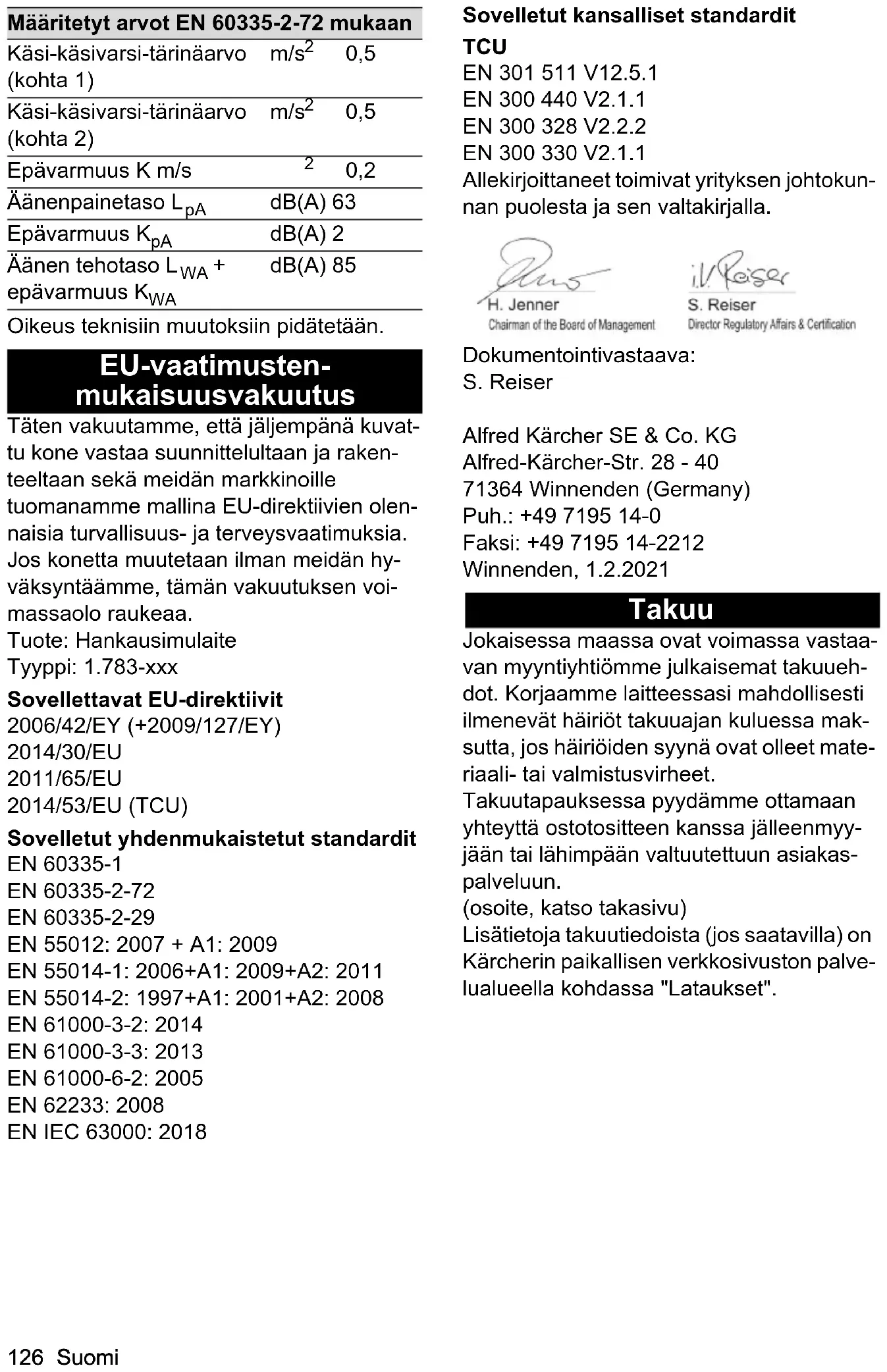 Tillatt totalvekt kg 65 Tom vekt (transportvekt) lbs (kg) 43138 Norsk Med forbehold om tekniske endringer. EU-samsvarserklæring Vi erklærer herved at maskinen beskrevet nedenfor på grunn av design og konstruk- sjon, samt i versjonen som vi har markeds- ført, oppfyller de relevante grunnleggende helse- og sikkerhetskravene i EU-direktive- ne. Endringer på maskinen uten avtale med oss, gjør at denne erklæringen blir ugyldig. Produkt: Gulvvaskemaskin Type: 1.783-xxx Gjeldende EU-direktiver 2006/42/EF (+2009/127/EF) 2014/30/EU 2011/65/EU 2014/53/EU (TCU) Anvendte harmoniserte standarder EN 60335-1 EN 60335-2-72 EN 60335-2-29 EN 55012: 2007 + A1: 2009 EN 55014-1: 2006+A1: 2009+A2: 2011 EN 55014-2: 1997+A1: 2001+A2: 2008 EN 61000-3-2: 2014 EN 61000-3-3: 2013 EN 61000-6-2: 2005 EN 62233: 2008 EN IEC 63000: 2018 Anvendte nasjonale standarder TCU EN 301 511 V12.5.1 EN 300 440 V2.1.1 EN 300 328 V2.2.2 EN 300 330 V2.1.1 Undertegnede handler på vegne av og med fullmakt fra styret. Dokumentasjonsfullmektig: S. Reiser Alfred Kärcher SE & Co. KG Alfred-Kärcher-Str. 28 - 40 71364 Winnenden (Germany) Tlf.: +49 7195 14-0 Faks: +49 7195 14-2212 Winnenden, 2021/02/01 Garanti Vår ansvarlige salgsorganisasjon for de en- kelte land har utgitt garantibetingelsene som gjelder i det aktuelle landet. Eventuelle feil på apparatet repareres gratis i garantiti- den dersom disse kan føres tilbake til mate- rial- eller produksjonsfeil. Ved behov for garantireparasjoner bes du henvende deg til din forhandler eller nærmeste autoriserte kundeservice og fremvise kjøpskvitterin- gen. (Se adresse på baksiden) Videre garantiinformasjon (hvis tilgjengelig) finner du i serviceområdet på ditt lokale Kärcher-nettsted under "Nedlastinger". Registrerte verdier iht. EN 60335-2-72 Hånd-arm-vibrasjonsver- di (posisjon 1) m/s