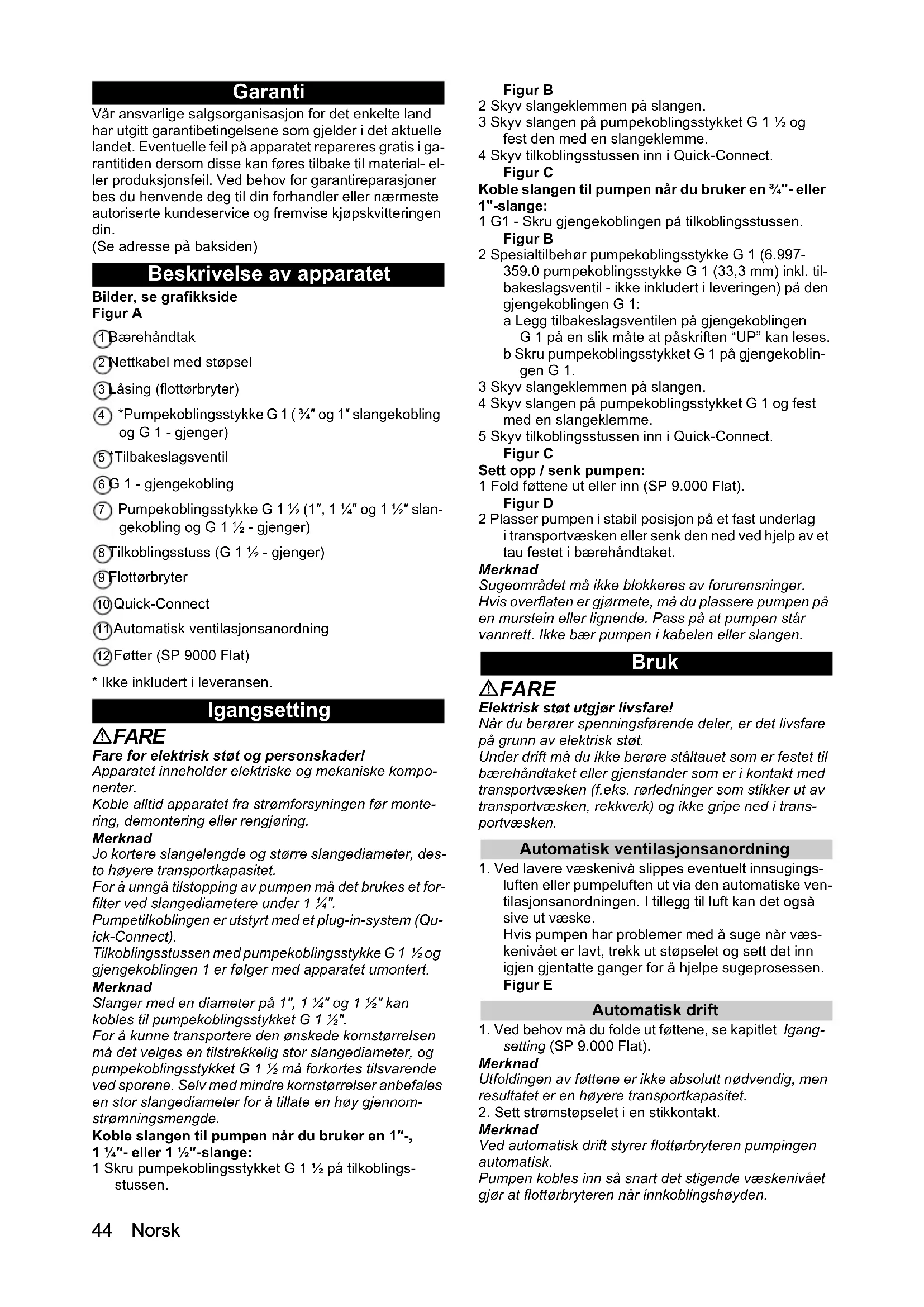 Utbedring av feil Feil har oftest enkle årsaker som du selv kan utbedre ved hjelp av følgende oversikt. I tvilstilfeller, eller ved Min / Max SP 9.000 Flat SP 9.500 Dirt SP 11.000 Dirt Innkoblings- høyde cm* 36 / 44 43 / 50 43 / 50 Utkoblings- høyde cm* 15 / 24 18 / 30 18 / 3046 Norsk driftsforstyrrelser som ikke er nevnt her, kan du kontakte vår autoriserte kundeservice. Tekniske data Med forbehold om tekniske endringer. Feil Årsak Utbedring Pumpe går, men den transporterer ikke Det er luft i pumpen. 1. Kontroller om igangsettingen er korrekt (se kapittel Igangsetting og Bruk). Smusspartikler blokkerer sugeområdet. 1. Trekk støpselet ut av stikkontakten.