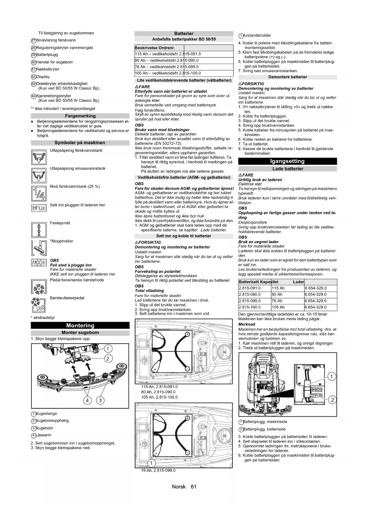 - EU-samsvarserklæring Følg anvisningene i bruksanvisningen for batteriet, på batteriene og i denne bruks- veiledningen. Bruk vernebriller. Hold barn unna syre og batterier. Eksplosjonsfare Åpen ild, gnister, åpent lys og røyking er forbudt. Fare for etsing Førstehjelp. Advarsler Avfallshåndtering Batterier må ikke kastes i husholdnings- avfallet.60 Norsk Beskrivelse av maskinen Oversikt over maskinen 1 Grovsmussil2 Losil3 Flottør4 Børstehode5 Skivebørste6 Håndtak7 Sikkerhetsbryter8 Tappeslange for smussvann med doseringsinnret- ning 9 Deksel smussvannstank10 Home Base holdeskinne11 Smussvannstank12 **Batteri13 Ferskvannsfilter14 Utløp ferskvannstank15 Børsteutløserpedal16 Sprutbeskyttelse17 Ferskvannstank18 Typeskilt19 Slangeklemme20 Påfyllingstrakt ferskvannstank21 Sugebom22 Sugebomlås23 Børstehodepedal24 Hellingsjustering sugebom25 Sugeslange26 Eksenterspak p. 65