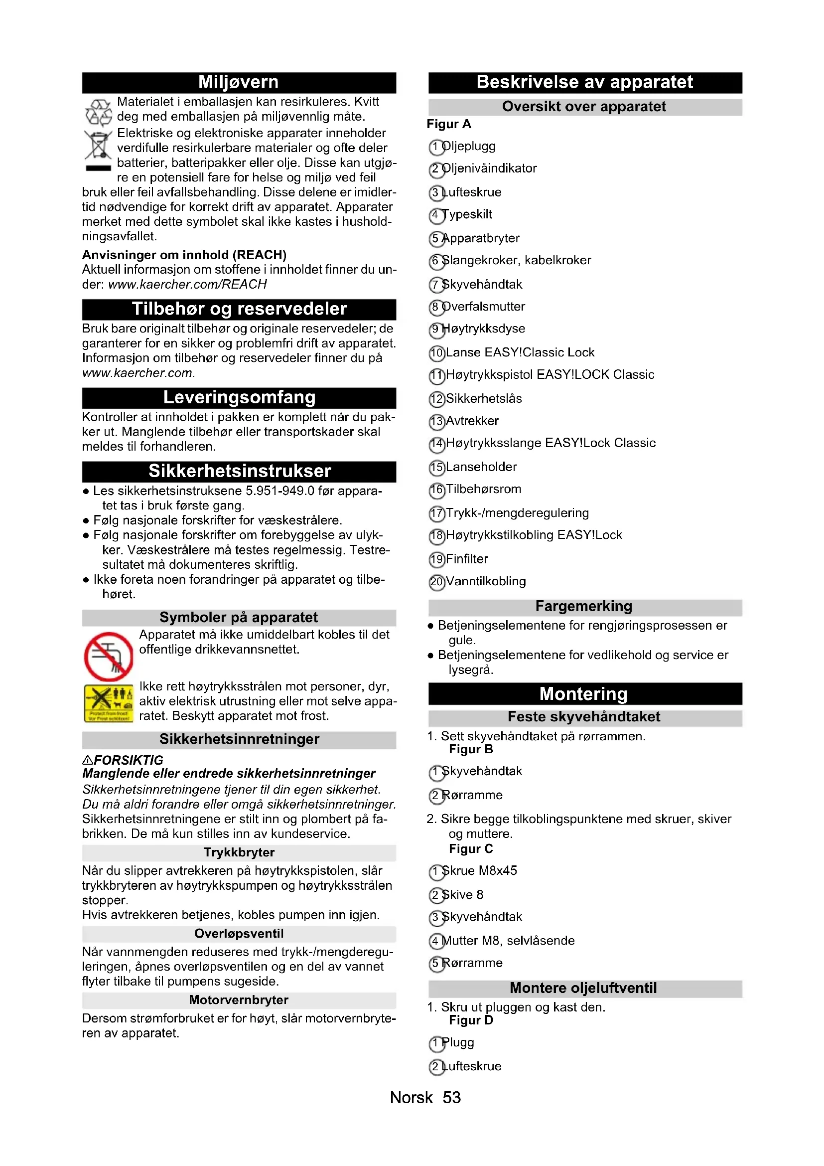 - EU-samsvarserklæring Norsk 53 Miljøvern Materialet i emballasjen kan resirkuleres. Kvitt deg med emballasjen på miljøvennlig måte. Elektriske og elektroniske apparater inneholder verdifulle resirkulerbare materialer og ofte deler batterier, batteripakker eller olje. Disse kan utgjø- re en potensiell fare for helse og miljø ved feil bruk eller feil avfallsbehandling. Disse delene er imidler- tid nødvendige for korrekt drift av apparatet. Apparater merket med dette symbolet skal ikke kastes i hushold- ningsavfallet. Anvisninger om innhold (REACH) Aktuell informasjon om stoffene i innholdet finner du un- der: www.kaercher.com/REACH Tilbehør og reservedeler Bruk bare originalt tilbehør og originale reservedeler; de garanterer for en sikker og problemfri drift av apparatet. Informasjon om tilbehør og reservedeler finner du på www.kaercher.com. Leveringsomfang Kontroller at innholdet i pakken er komplett når du pak- ker ut. Manglende tilbehør eller transportskader skal meldes til forhandleren. Sikkerhetsinstrukser ● Les sikkerhetsinstruksene 5.951-949.0 før appara- tet tas i bruk første gang. ● Følg nasjonale forskrifter for væskestrålere. ● Følg nasjonale forskrifter om forebyggelse av ulyk- ker. Væskestrålere må testes regelmessig. Testre- sultatet må dokumenteres skriftlig. ● Ikke foreta noen forandringer på apparatet og tilbe- høret. Symboler på apparatet Apparatet må ikke umiddelbart kobles til det offentlige drikkevannsnettet. Ikke rett høytrykksstrålen mot personer, dyr, aktiv elektrisk utrustning eller mot selve appa- ratet. Beskytt apparatet mot frost. Sikkerhetsinnretninger 몇 FORSIKTIG Manglende eller endrede sikkerhetsinnretninger Sikkerhetsinnretningene tjener til din egen sikkerhet. Du må aldri forandre eller omgå sikkerhetsinnretninger. Sikkerhetsinnretningene er stilt inn og plombert på fa- brikken. De må kun stilles inn av kundeservice. Trykkbryter Når du slipper avtrekkeren på høytrykkspistolen, slår trykkbryteren av høytrykkspumpen og høytrykksstrålen stopper. Hvis avtrekkeren betjenes, kobles pumpen inn igjen. Overløpsventil Når vannmengden reduseres med trykk-/mengderegu- leringen, åpnes overløpsventilen og en del av vannet flyter tilbake til pumpens sugeside. Motorvernbryter Dersom strømforbruket er for høyt, slår motorvernbryte- ren av apparatet. Beskrivelse av apparatet Oversikt over apparatet Figur A 1 Oljeplugg 2 Oljenivåindikator 3 Lufteskrue 4 Typeskilt 5 Apparatbryter 6 Slangekroker, kabelkroker 7 Skyvehåndtak 8 Overfalsmutter 9 Høytrykksdyse 10 Lanse EASY!Classic Lock 11 Høytrykkspistol EASY!LOCK Classic 12 Sikkerhetslås 13 Avtrekker 14 Høytrykksslange EASY!Lock Classic 15 Lanseholder 16 Tilbehørsrom 17 Trykk-/mengderegulering 18 Høytrykkstilkobling EASY!Lock 19 Finfilter 20 Vanntilkobling Fargemerking ● Betjeningselementene for rengjøringsprosessen er gule. ● Betjeningselementene for vedlikehold og service er lysegrå. Montering Feste skyvehåndtaket p. 57
