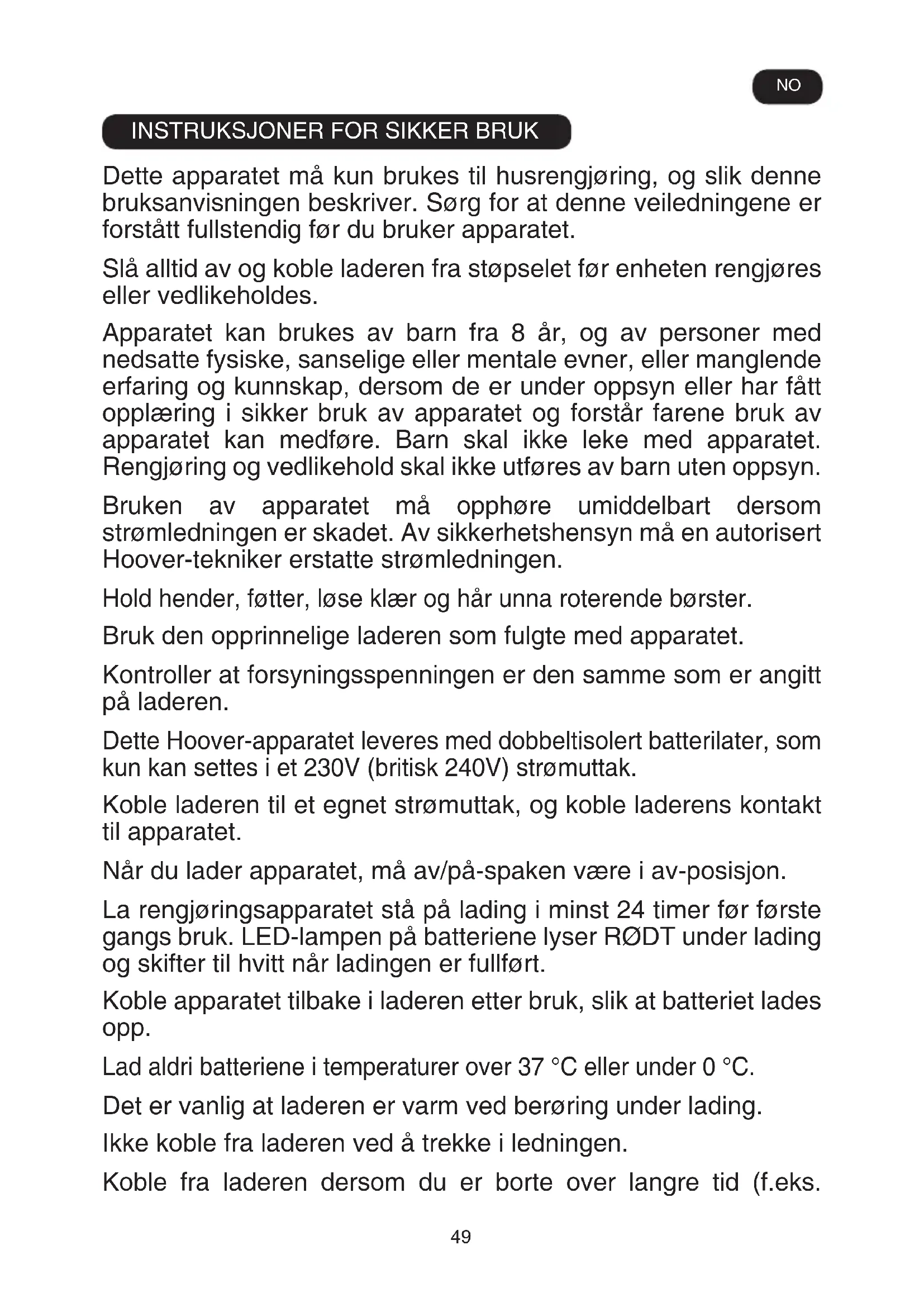 Dette apparatet må kun brukes til husrengjøring, og slik denne bruksanvisningen beskriver. Sørg for at denne veiledningene er forstått fullstendig før du bruker apparatet. Slå alltid av og koble laderen fra støpselet før enheten rengjøres eller vedlikeholdes. Apparatet kan brukes av barn fra 8 år, og av personer med nedsatte fysiske, sanselige eller mentale evner, eller manglende erfaring og kunnskap, dersom de er under oppsyn eller har fått opplæring i sikker bruk av apparatet og forstår farene bruk av apparatet kan medføre. Barn skal ikke leke med apparatet. Rengjøring og vedlikehold skal ikke utføres av barn uten oppsyn. Bruken av apparatet må opphøre umiddelbart dersom strømledningen er skadet. Av sikkerhetshensyn må en autorisert Hoover-tekniker erstatte strømledningen. Hold hender, føtter, løse klær og hår unna roterende børster. Bruk den opprinnelige laderen som fulgte med apparatet. Kontroller at forsyningsspenningen er den samme som er angitt på laderen. Dette Hoover-apparatet leveres med dobbeltisolert batterilater, som kun kan settes i et 230V (britisk 240V) strømuttak. Koble laderen til et egnet strømuttak, og koble laderens kontakt til apparatet. Når du lader apparatet, må av/på-spaken være i av-posisjon. La rengjøringsapparatet stå på lading i minst 24 timer før første gangs bruk. LED-lampen på batteriene lyser RØDT under lading og skifter til hvitt når ladingen er fullført. Koble apparatet tilbake i laderen etter bruk, slik at batteriet lades opp. Lad aldri batteriene i temperaturer over 37 °C eller under 0 °C. Det er vanlig at laderen er varm ved berøring under lading. Ikke koble fra laderen ved å trekke i ledningen. Koble fra laderen dersom du er borte over langre tid (f.eks. NO50 ferie). Produktet bør lades opp igjen før bruk, da batteriene kan selvutløses ved lengre tids lagring. Hvis apparatet skal avhendes, bør batteriene fjernes først. Apparatet må være frakoblet strømnettet når du fjerner batteriet. Kast batteriene på en trygg måte. La apparatet gå til den stopper fordi batteriene er helt tømt. Brukte batterier bør leveres til en gjenbruksstasjon, og ikke kastes sammen med husholdningsavfall. For å fjerne batteriene, bør du kontakte Hoovers kundesenter, eller fortsette som anvist nedenfor: VIKTIG: Påse at batteriene er fulladede før du fjerner dem. La rengjøringsapparatet gå til batteriene er helt tømt. Ta laderkontakten ut av apparatet. Trykk på knappene som frigjør batteripakken og dra den ut. [11] MERK: Hvis du har vanskeligheter med å demontere enheten eller ønsker mer detaljert informasjon om behandling, gjenvinning og resirkulering av apparatet, ta kontakt med kommunen eller renovasjonsselskapet. Bruk kun tilbehør, forbruksvarer eller reservedeler som anbefales eller leveres av Hoover. Statisk elektrisitet: Enkelte tepper kan bygge opp små mengder statisk elektrisitet. Utladning av statisk elektrisitet er ikke helseskadelig. Du må ikke bruke apparatet utendørs, på våte overflater eller til å støvsuge væske. Du må ikke støvsuge harde eller skarpe objekter, varm aske, sigarettsneiper eller andre liknende gjenstander. Apparatet må ikke utsettes for eller støvsuge opp brennbare væsker, rengjøringsmidler, aerosoler eller damp fra slike væsker. Unngå å kjøre over ledningen eller trekke ut støpselet under bruk. Ikke fortsett å bruke rengjøringsapparatet eller laderen hvis det virker som om det er noe feil med dem. Hoover-service: For å sikre at apparatet fortsatt virker som det skal, og er trygt å bruke, anbefaler vi at all service og alle reparasjoner blir utført av en autorisert Hoover-tekniker. NOPRODUKTKOMPONENTER