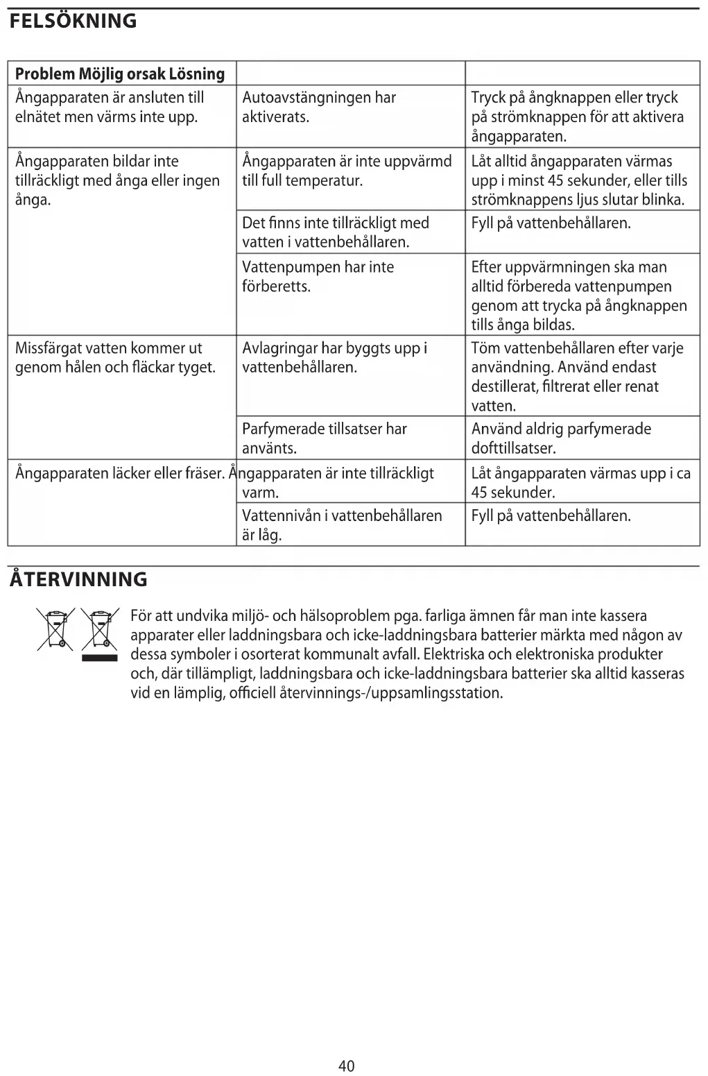 AE44 FEILSØKING Problem Mulig årsak Løsning Damperen er plugget i, men varmer ikke. Automatisk av-funksjon er skrudd på. Trykk dampknappen eller trykk strømknappen for å aktivere damperen. Ikke nok damp, eller dampen kommer ikke ut av damperen. Damperen er ikke varmet opp til full temperaturstyrke. La alltid damperen varme seg opp i minst 45 sekunder, eller til strømknapplyset stopper å blinke. Det er ikke nok vann i vannbeholderen. Fyll vannbeholderen. Vannpumpen er ikke fylt opp. Etter forvarming, fyll alltid opp vannpumpen ved å holde inne dampknappen til det danner seg damp. Misfarget vann kommer ut gjennom hullene og setter ekker på stoet. Avfallsstoer har lagt seg på innsiden av vannbeholderen. Tøm vannbeholderen etter hver bruk. Bruk bare destillert, ltrert eller renset vann. Parfyme eller parfymerte tilsetningsstoer ble brukt. Bruk aldri parfymer eller parfymerte tilsetningsstoer. Damperen lekker. Damperen er ikke varm nok. La damperen varme seg opp i rundt 45 sekunder. Vannbeholderen har lite vann. Fyll vannbeholderen. RESIRKULERING