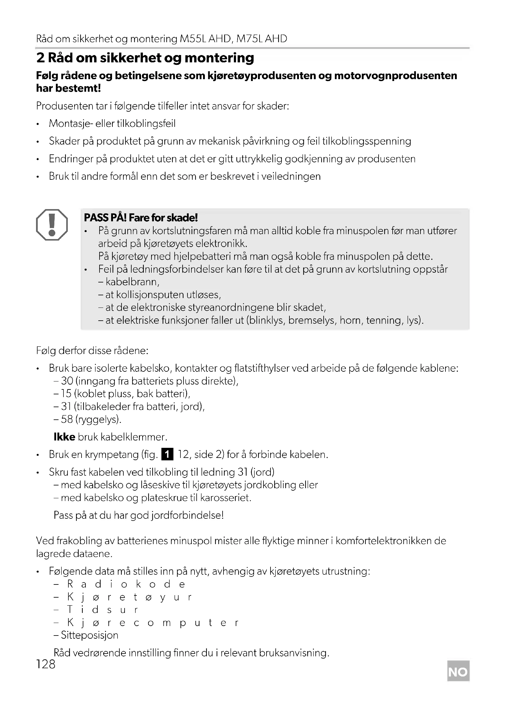 2 Råd om sikkerhet og montering Følg rådene og betingelsene som kjøretøyprodusenten og motorvognprodusenten har bestemt! Produsenten tar i følgende tilfeller intet ansvar for skader: