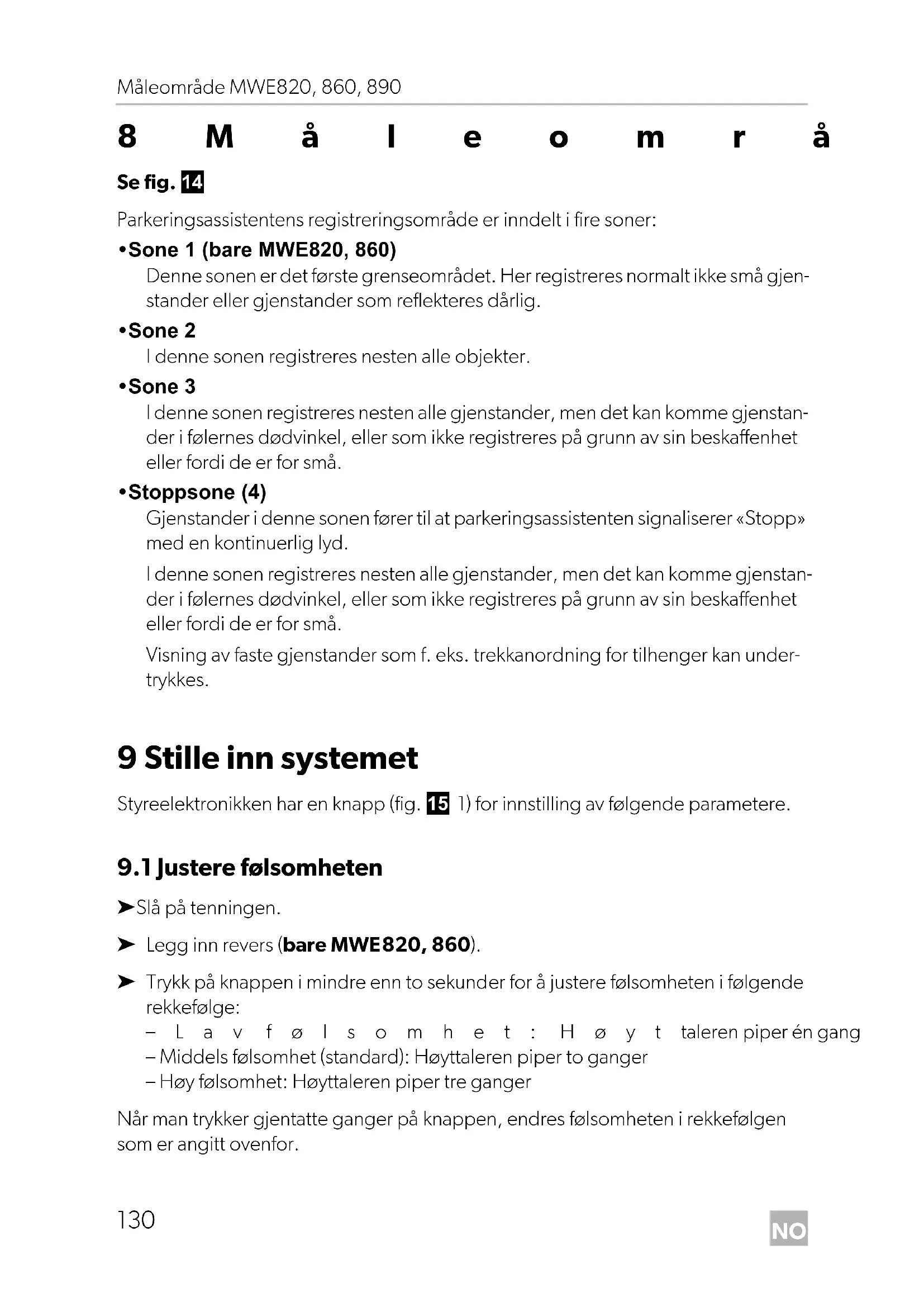 ➤ Slå på tenningen. ➤ Legg inn revers (bare MWE820, 860). ➤ Trykk på knappen i mindre enn to sekunder for å justere følsomheten i følgende rekkefølge: –Lav følsomhet: Høyttaleren piper én gang – Middels følsomhet (standard): Høyttaleren piper to ganger – Høy følsomhet: Høyttaleren piper tre ganger Når man trykker gjentatte ganger på knappen, endres følsomheten i rekkefølgen som er angitt ovenfor. MWE820-860-890-IO-16s.book Seite 130 Freitag, 26. August 2016 9:19 21NO MWE820, 860, 890 Stille inn systemet