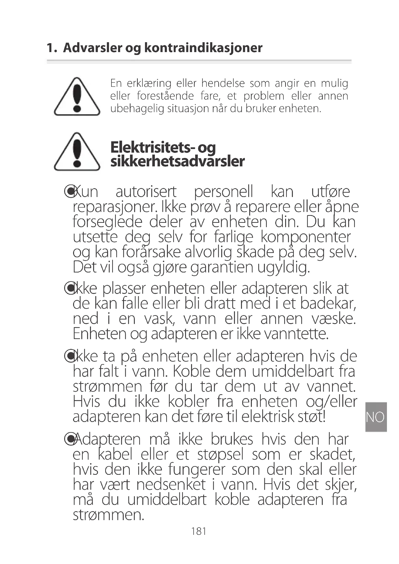 Kontraindikasjoner Denne enheten, inkludert alle enhetens deler, skal ikke brukes av følgende personer: Barn under 18 år, voksne med begrensede fysiske, sensoriske eller psykiske evner, eller som mangler erfaring med eller kunnskap om hvordan man bruker enheten på en trygg måte, eller som ikke forstår farene som er forbundet med bruk av enheten. Må ikke brukes hvis du