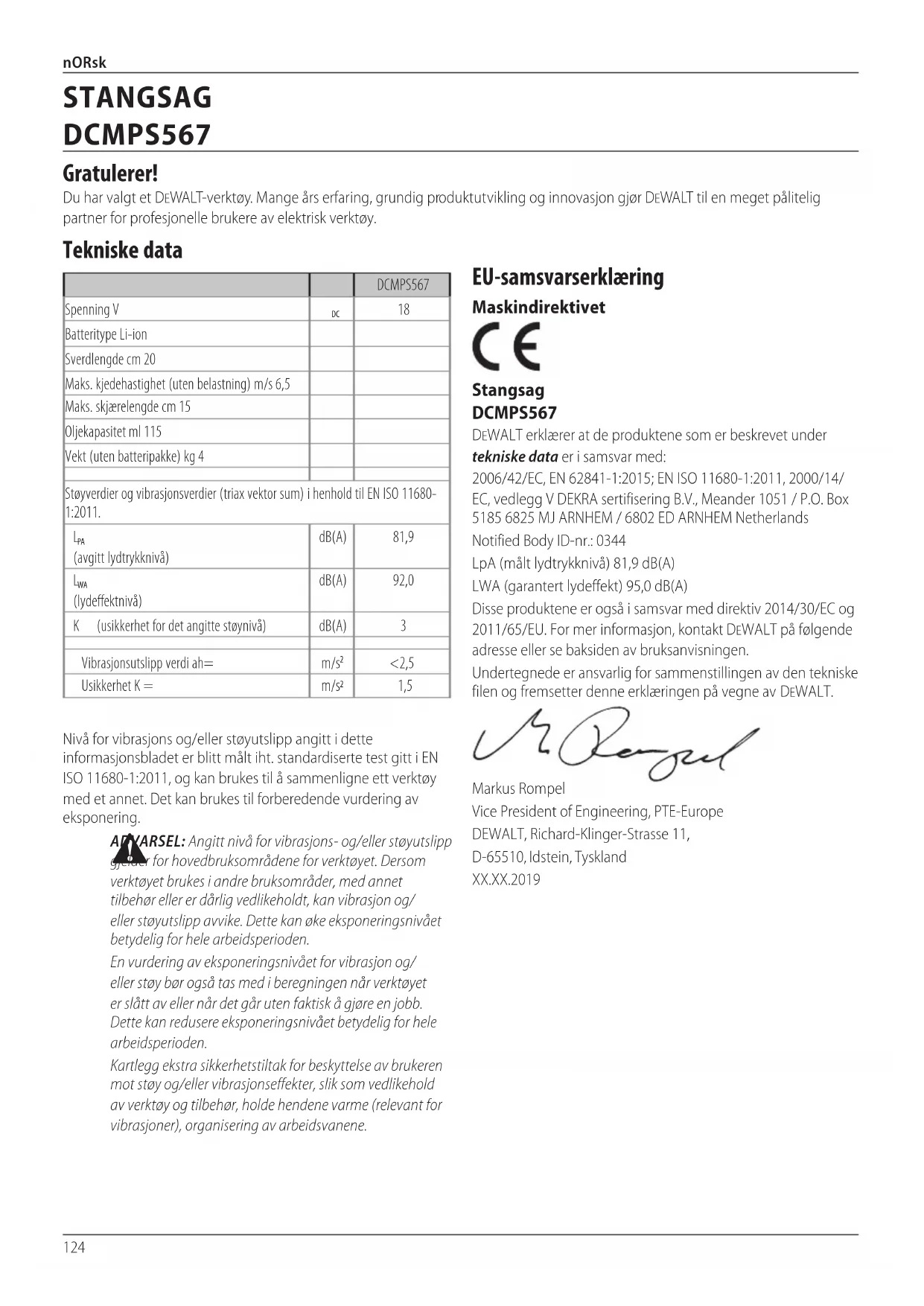 ADVARSEL: Angitt nivå for vibrasjons- og/eller støyutslipp gjelder for hovedbruksområdene for verktøyet. Dersom verktøyet brukes i andre bruksområder, med annet tilbehør eller er dårlig vedlikeholdt, kan vibrasjon og/ eller støyutslipp avvike. Dette kan øke eksponeringsnivået betydelig for hele arbeidsperioden. En vurdering av eksponeringsnivået for vibrasjon og/ eller støy bør også tas med i beregningen når verktøyet er slått av eller når det går uten faktisk å gjøre en jobb. Dette kan redusere eksponeringsnivået betydelig for hele arbeidsperioden. Kartlegg ekstra sikkerhetstiltak for beskyttelse av brukeren mot støy og/eller vibrasjonseffekter, slik som vedlikehold av verktøy og tilbehør, holde hendene varme (relevant for vibrasjoner), organisering av arbeidsvanene. Norsk (oversatt fra de originale instruksjonene) Gratulerer! Du har valgt et DeWALT-verktøy. Mange års erfaring, grundig produktutvikling og innovasjon gjør DeWALT til en meget pålitelig partner for profesjonelle brukere av elektriskverktøy. Tekniske data STANGSAG DCMPS567 DCMPS567 Spenning V