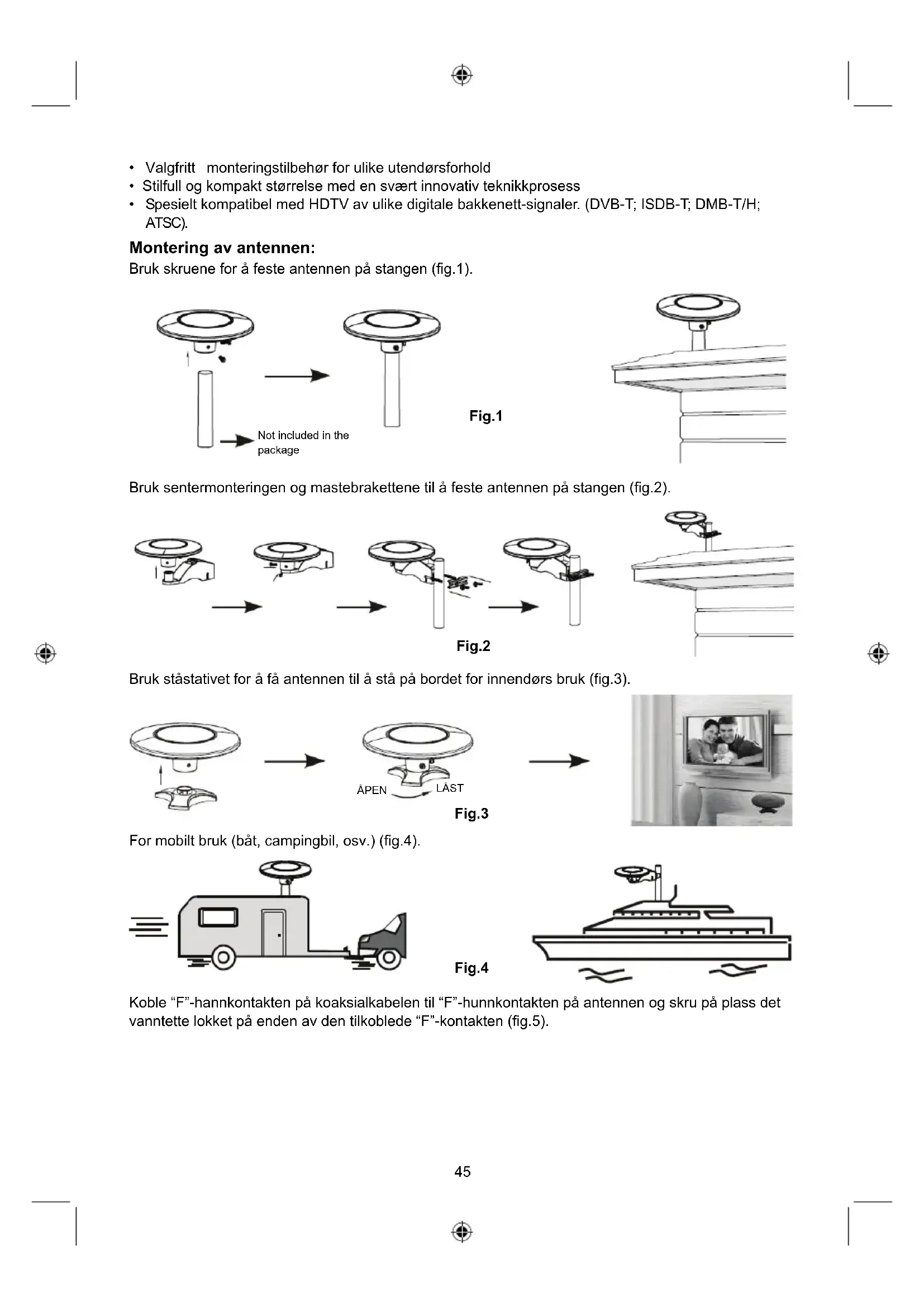 - Spesielt kompatibel med HDTV av ulike digitale bakkenett-signaler. (DVB-T; ISDB-T; DMB-T/H; ATSC). Montering av antennen: Bruk skruene for å feste antennen på stangen (fig.1). Bruk sentermonteringen og mastebrakettene til å feste antennen på stangen (fig.2). Bruk ståstativet for å få antennen til å stå på bordet for innendørs bruk (fig.3). For mobilt bruk (båt, campingbil, osv.) (fig.4). Koble “F”-hannkontakten på koaksialkabelen til “F”-hunnkontakten på antennen og skru på plass det vanntette lokket på enden av den tilkoblede “F”-kontakten (fig.5). Not included in the package Fig.1 Fig.2 ÅPEN LÅST Fig.3 Fig.446 Installasjon: Installasjon via en separat AC/DC-adapter: Installasjon via DTV set-top-boks: Merknad: Etter at du har montert antennen og fullført installasjonen, vennligst juster antennen slik at den mottar det skarpeste TV-bildet. Fest deretter antennen slik at kvaliteten vedvarer. Dekk til koaksialkabelen av sikkerhetsmessige hensyn. Driftsinstruksjoner: For best mulig mottak, vennligst kontroller følgende forhold: