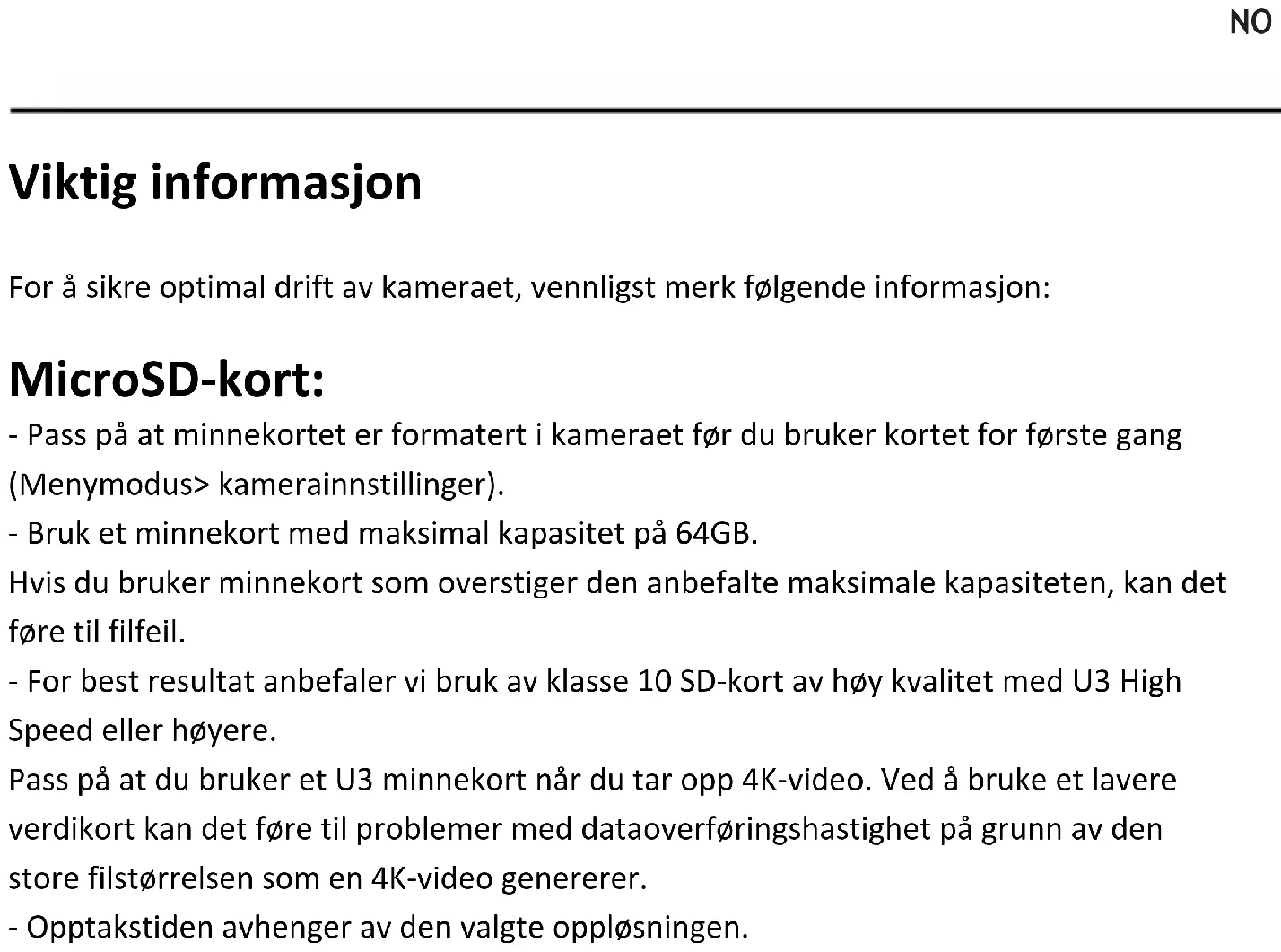 Viktig informasjon For å sikre optimal drift av kameraet, vennligst merk følgende informasjon: MicroSD-kort: - Pass på at minnekortet er formatert i kameraet før du bruker kortet for første gang (Menymodus> kamerainnstillinger). - Bruk et minnekort med maksimal kapasitet på 64GB. Hvis du bruker minnekort som overstiger den anbefalte maksimale kapasiteten, kan det føre til filfeil. - For best resultat anbefaler vi bruk av klasse 10 SD-kort av høy kvalitet med U3 High Speed eller høyere. Pass på at du bruker et U3 minnekort når du tar opp 4K-video. Ved å bruke et lavere verdikort kan det føre til problemer med dataoverføringshastighet på grunn av den store filstørrelsen som en 4K-video genererer. - Opptakstiden avhenger av den valgte oppløsningen.NO