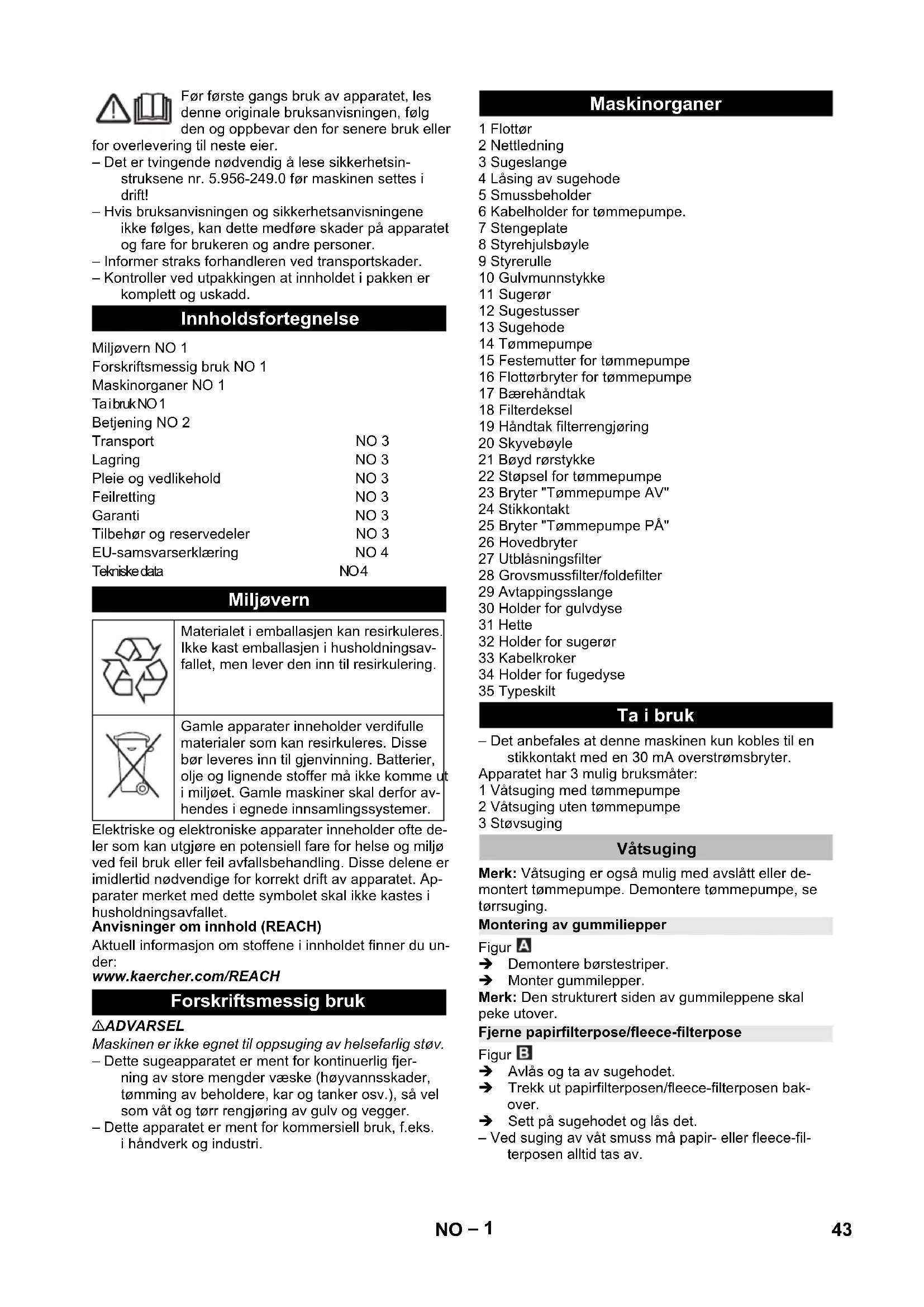 Partnr. Kabellængde EU 6.649-413.0 10 m CH 6.649-254.0 10 m 42 DA– 1 Før første gangs bruk av apparatet, les denne originale bruksanvisningen, følg den og oppbevar den for senere bruk eller for overlevering til neste eier. – Det er tvingende nødvendig å lese sikkerhetsin- struksene nr. 5.956-249.0 før maskinen settes i drift! – Hvis bruksanvisningen og sikkerhetsanvisningene ikke følges, kan dette medføre skader på apparatet og fare for brukeren og andre personer. – Informer straks forhandleren ved transportskader. – Kontroller ved utpakkingen at innholdet i pakken er komplett og uskadd. Elektriske og elektroniske apparater inneholder ofte de- ler som kan utgjøre en potensiell fare for helse og miljø ved feil bruk eller feil avfallsbehandling. Disse delene er imidlertid nødvendige for korrekt drift av apparatet. Ap- parater merket med dette symbolet skal ikke kastes i husholdningsavfallet. Anvisninger om innhold (REACH) Aktuell informasjon om stoffene i innholdet finner du un- der: www.kaercher.com/REACH 몇 ADVARSEL Maskinen er ikke egnet til oppsuging av helsefarlig støv. – Dette sugeapparatet er ment for kontinuerlig fjer- ning av store mengder væske (høyvannsskader, tømming av beholdere, kar og tanker osv.), så vel som våt og tørr rengjøring av gulv og vegger. – Dette apparatet er ment for kommersiell bruk, f.eks. i håndverk og industri. 1 Flottør 2 Nettledning 3 Sugeslange 4 Låsing av sugehode 5 Smussbeholder 6 Kabelholder for tømmepumpe. 7 Stengeplate 8 Styrehjulsbøyle 9 Styrerulle 10 Gulvmunnstykke 11 Sugerør 12 Sugestusser 13 Sugehode 14 Tømmepumpe 15 Festemutter for tømmepumpe 16 Flottørbryter for tømmepumpe 17 Bærehåndtak 18 Filterdeksel 19 Håndtak filterrengjøring 20 Skyvebøyle 21 Bøyd rørstykke 22 Støpsel for tømmepumpe 23 Bryter "Tømmepumpe AV" 24 Stikkontakt 25 Bryter "Tømmepumpe PÅ" 26 Hovedbryter 27 Utblåsningsfilter 28 Grovsmussfilter/foldefilter 29 Avtappingsslange 30 Holder for gulvdyse 31 Hette 32 Holder for sugerør 33 Kabelkroker 34 Holder for fugedyse 35 Typeskilt – Det anbefales at denne maskinen kun kobles til en stikkontakt med en 30 mA overstrømsbryter. Apparatet har 3 mulig bruksmåter: 1 Våtsuging med tømmepumpe 2 Våtsuging uten tømmepumpe 3 Støvsuging Merk: Våtsuging er også mulig med avslått eller de- montert tømmepumpe. Demontere tømmepumpe, se tørrsuging. Figur Demontere børstestriper. Monter gummilepper. Merk: Den strukturert siden av gummileppene skal peke utover. Figur Avlås og ta av sugehodet. Trekk ut papirfilterposen/fleece-filterposen bak- over. Sett på sugehodet og lås det. – Ved suging av våt smuss må papir- eller fleece-fil- terposen alltid tas av. Innholdsfortegnelse Miljøvern NO 1 Forskriftsmessig bruk NO 1 Maskinorganer NO 1 Ta i bruk NO 1 Betjening NO 2 Transport NO 3 Lagring NO 3 Pleie og vedlikehold NO 3 Feilretting NO 3 Garanti NO 3 Tilbehør og reservedeler NO 3 EU-samsvarserklæring NO 4 Tekniske data NO 4 Miljøvern Materialet i emballasjen kan resirkuleres. Ikke kast emballasjen i husholdningsav- fallet, men lever den inn til resirkulering. Gamle apparater inneholder verdifulle materialer som kan resirkuleres. Disse bør leveres inn til gjenvinning. Batterier, olje og lignende stoffer må ikke komme ut i miljøet. Gamle maskiner skal derfor av- hendes i egnede innsamlingssystemer. Forskriftsmessig bruk Maskinorganer Ta i bruk Våtsuging Montering av gummiliepper Fjerne papirfilterpose/fleece-filterpose 43NO– 2 Figur Avlås og ta av sugehodet. Ta av membranfilter. Sett på sugehodet og lås det. – Ved suging av våt smuss må membranfilteret alltid tas av. Åpne filterdeksel. Ta ut foldefilter. Montere grovsmussfilter Lukk filterdeksel, du skal høre det går i lås. Figur Ta av hetten. Koble til tømmeslange (nominell diameter 3/4“ eller større). 몇 FORSIKTIG Ta hensyn til de lokale utslippsforskrifter. Figur Tapp ut spillvannet via tappeslangen. OBS Ved suging skal grovsmussfilteret aldri fjernes. – Våtsuging uten tømmepumpe: Det anbefales å bruke en spesialfilterpose (våt) (se Filtersystemer). – Ved oppnådd maks. væskenivå slår apparatet seg automatisk av. – Etter avsluttet våtsuging: Rengjør flottør, beholder og eventuelt tømmepumpen med en fuktig klut og tørk dem. OBS Før tørrsuging: Demonter tømmepumpe og monter fol- defilter. Merk: Ved tørrsuging skal det vanligvis brukes et folde- filter. OBS Ved suging skal aldri det flate foldefilteret fjernes. – Ved oppsuging av finstøv kan det i tillegg brukes en papirfilterpose, fleece-filterpose eller et membran- filter. Ta ut støpselet på tømmepumpen Avlås og ta av sugehodet. Figur Skru av festemutter for tømmepumpen. Ta av kabelholder på tømmepumpen og erstatt med stengeplaten. Ta bortfraktingspumpen og plastinnsatsen samti- dig ut av beholderen, ellers kan flottørbryteren til bortfraktingspumpen skades, da den er festet på plastinnsatsen. Figur Sett på hetten i stedet for tømmeslangen. Sett på sugehodet og lås det. Merk: Foldefilter er ikke del av leveransen. Åpne filterdeksel. Ta ut grovsmussfilteret. Montere foldefilter. Lukk filterdeksel, du skal høre det går i lås. Figur Demonter gummilepper. Montere børstestriper. Merk: Papirfilterpose eller fleece-filterpose er ikke del av leveransen. Figur Avlås og ta av sugehodet. Sett på papir- eller fleece-filterpose. Sett på sugehodet og lås det. Merk: Membranfilter er ikke del av leveransen. Merk: Ved bruk uten papirfilterpose eller fleece-filterpo- sen må det brukes et membranfilter, for å beskytte su- gehodet. Figur Avlås og ta av sugehodet. Membranfilter trekkes over beholderkanten. Sett på sugehodet og lås det. Figur Sugeslangen er utstyrt med et clip-system. Alle C-40/C- DN-40-tilbehørsdeler kan tilkobles. FARE Fare for personskader og materielle skader! Stikkontak- ten er ment for direkte tilkobling av tømmepumpe til su- geren. Enhver annen bruk av stikkontakten er ikke tillatt. Sett inn maski