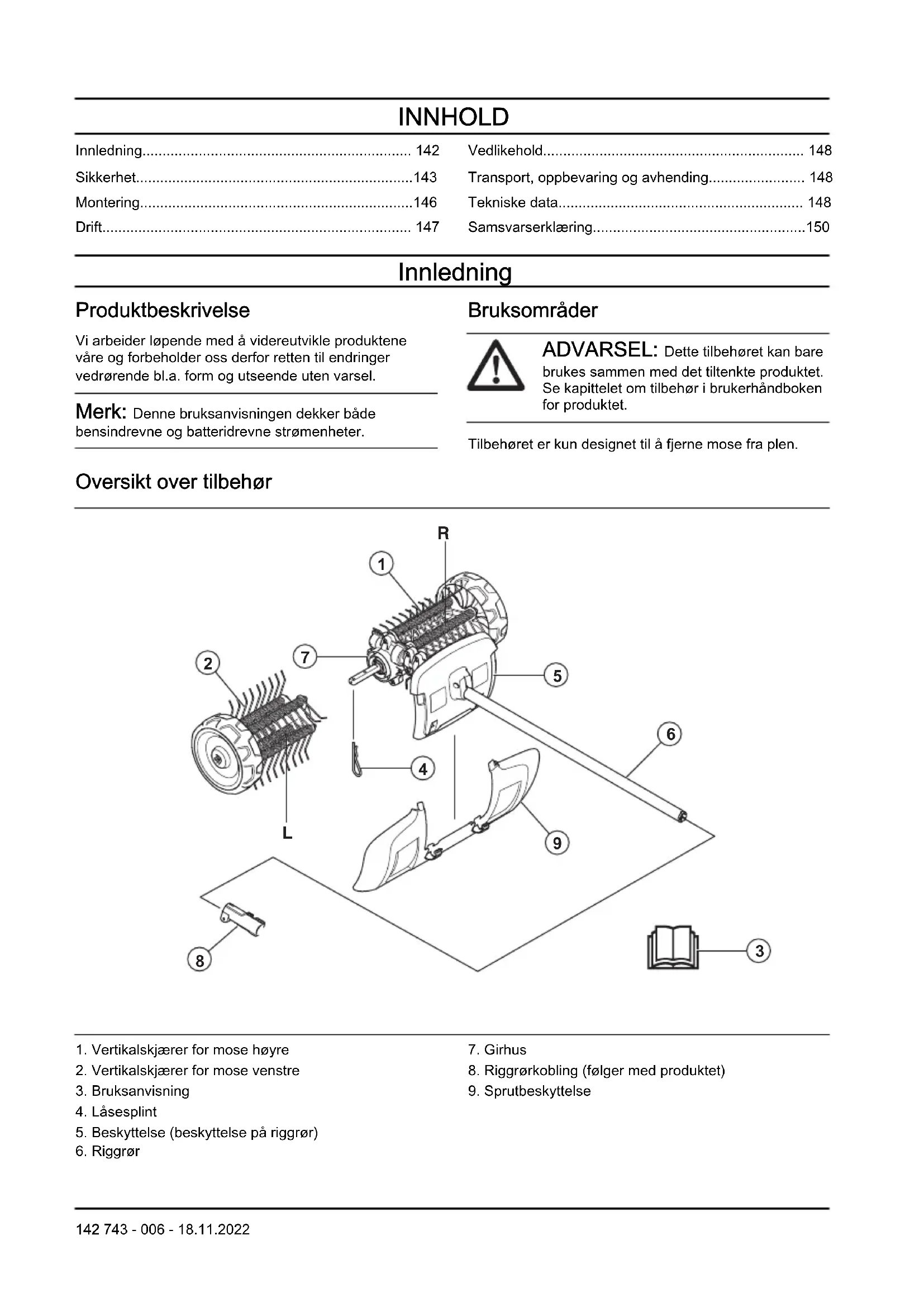 - Samsvarserklæring Innledning Produktbeskrivelse Vi arbeider løpende med å videreutvikle produktene våre og forbeholder oss derfor retten til endringer vedrørende bl.a. form og utseende uten varsel. Merk: Denne bruksanvisningen dekker både bensindrevne og batteridrevne strømenheter. Bruksområder ADVARSEL: Dette tilbehøret kan bare brukes sammen med det tiltenkte produktet. Se kapittelet om tilbehør i brukerhåndboken for produktet. Tilbehøret er kun designet til å fjerne mose fra plen. Oversikt over tilbehør p. 150