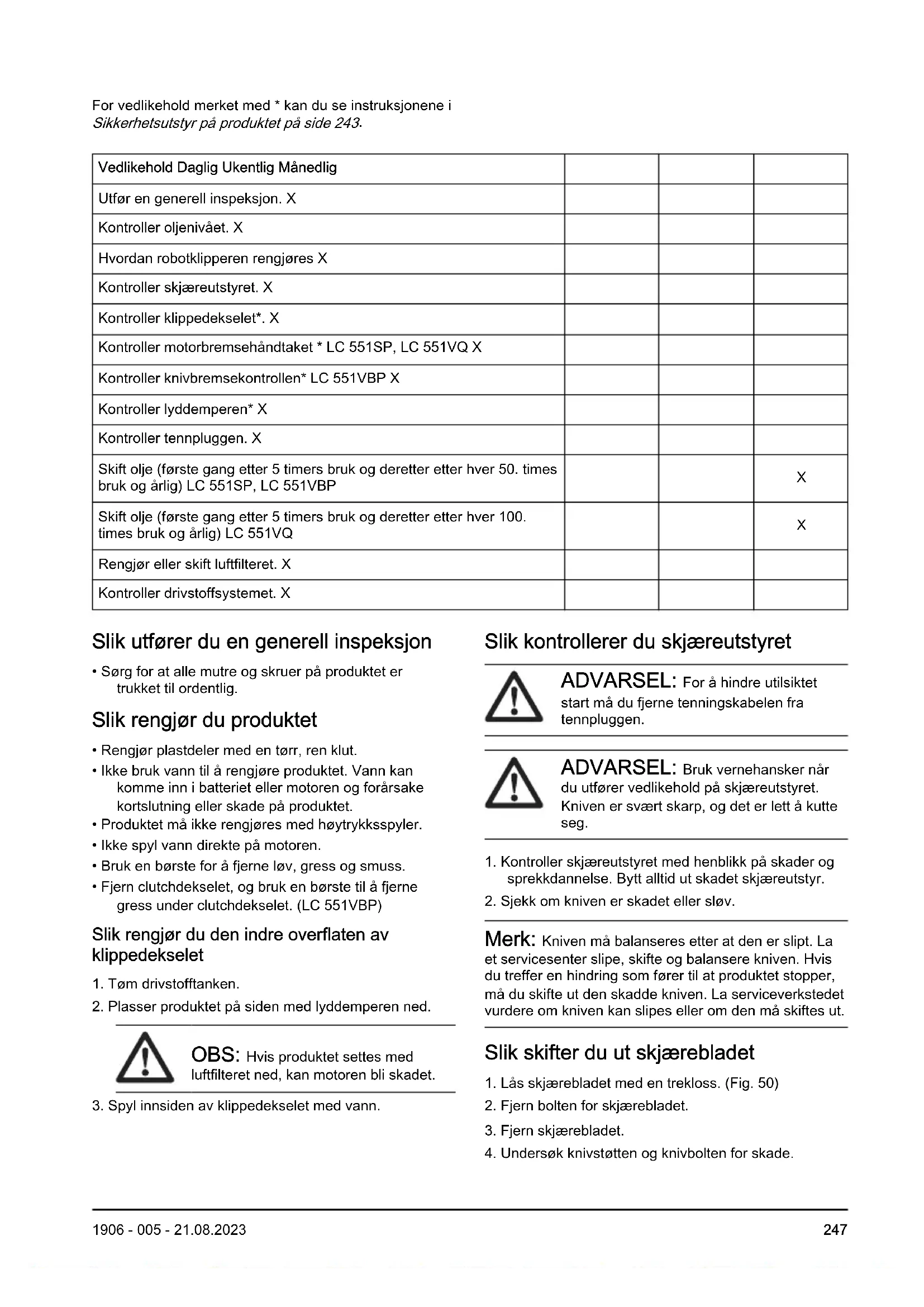 Vedlikehold Daglig Ukentlig Månedlig Utfør en generell inspeksjon. X Kontroller oljenivået. X Hvordan robotklipperen rengjøres X Kontroller skjæreutstyret. X Kontroller klippedekselet*. X Kontroller motorbremsehåndtaket * LC 551SP, LC 551VQ X Kontroller knivbremsekontrollen* LC 551VBP X Kontroller lyddemperen* X Kontroller tennpluggen. X Skift olje (første gang etter 5 timers bruk og deretter etter hver 50. times bruk og årlig) LC 551SP, LC 551VBP