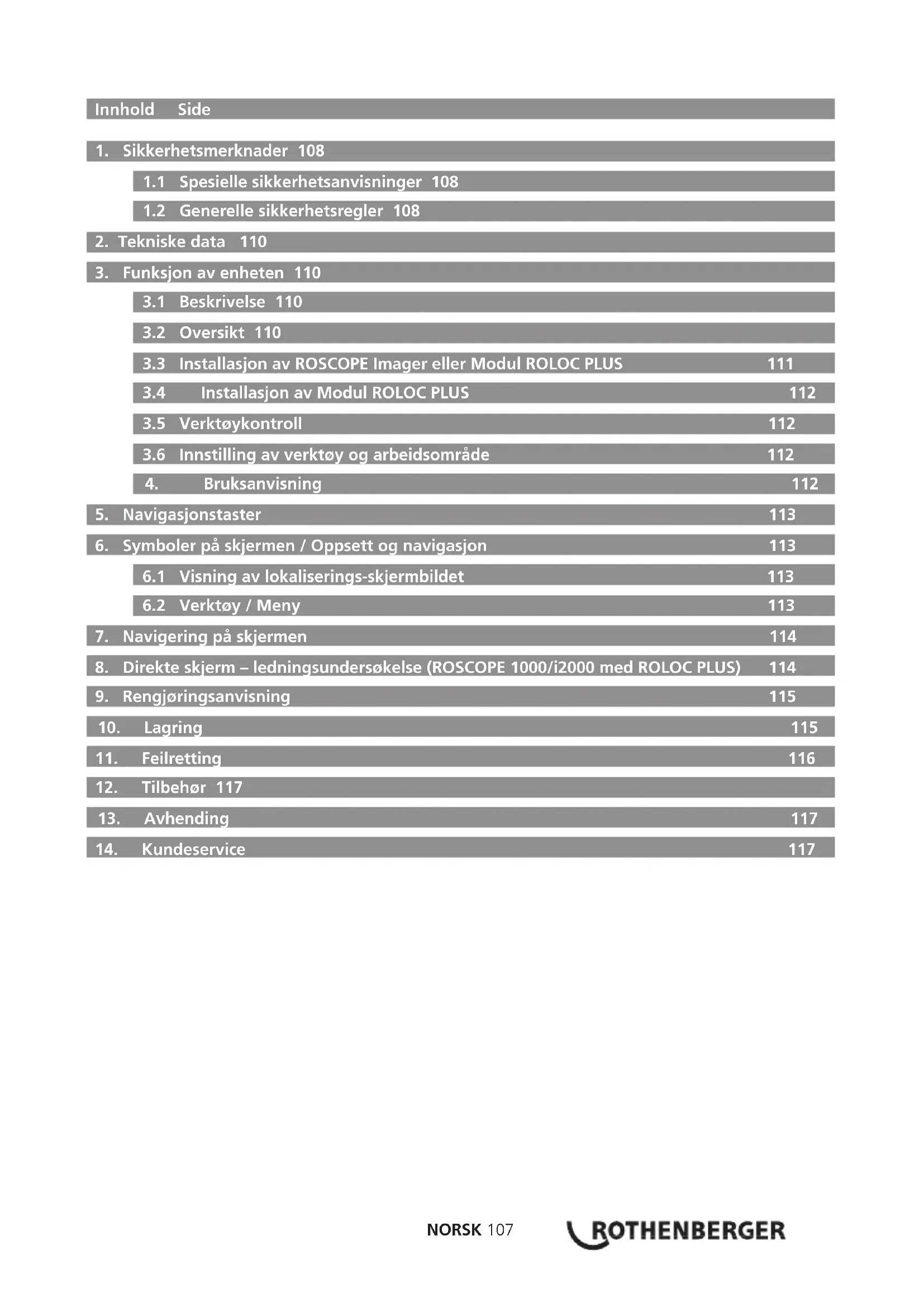 Symptom Mulig årsak Løsning Displayenheten slår seg ikke på Batteriet er utladet Lad opp batteriet Kontroller om det er batterier i batterirommet Kontakt ROTHENBERGER Servicesenter Feil ved elektronikken Kontakt serviceavdelingen Displayet slår seg på, men viser ikke noe bilde Løse kabelkoblinger Kontroller kabelkoblingene Bildehodet er dekket av rusk Rengjør bildehodet Displayet viser et statisk bilde (ingen respons) Bildeprosessoren har fått en feil Slå enheten AV og deretter PÅ for å nullstille prosessoren Batteriet holder ikke på ladingen Batteriet kan være noe utladet ved lagring Ta batteriene ut av apparatet ved lagring Brukstid avhengig av bruk av LED- lys Lad opp batteriet oftere ved mye bruk av LED-lyset Batteriet kan være skadet Skift batteri Levetiden av batteriet kan være utgått (antall sykluser) Skift batteri Intet signal Feil frekvens Kontroller frekvensen på sonden og velg ROLOC- frekvens via menyen Dyp måling viser: ROLOC PLUS har overskredet rekkevidden Søk etter sterkeste signal ROSCOPE 1000/i2000 Feilkode 1 “unplugged” Feil - modul satt inn og deretter tatt ut igjen Kontakt serviceavdelingen ROSCOPE 1000/i2000 Feilkode 2 “Digital / No Video Sync” Viser at en digital bildeomformer er identifisert, men ingen videosynkronisering blir utført Kontakt serviceavdelingen ROSCOPE 1000/i2000 Feilkode 3 “Analog / No Video Sync” Viser at en digital bildeomformer er identifisert, men ingen videosynkronisering blir utført Kontakt serviceavdelingen ROSCOPE 1000/i2000 Feilkode 4 (PPI) “Videodata ikke i korrekt format” Viser at videodata ikke er i korrekt format Kontakt serviceavdelingen ROSCOPE 1000/i2000 Feilkode 5 “Aurora fastslått” Dette er en tilstand der bildekildens automatiske korrekturskjema (kun for digital bildekilde) avgir et bilde med grafiske feil - bildeomformeren blir nullstilt. Dersom denne tilstanden vedvarer, etter flere gjentagelser, bør denne feilmeldingen vist. Kontakt serviceavdelingenNORSK 117 Symptom Mulig årsak Løsning ROSCOPE 1000/i2000 Feilkode 6 “Tilkobling eller død dataledning” Dette er en selvdiagnose-feil, der systemet konfigurerer seg selv, det kjøres da et testmønster for bildet. Dersom mønsteret ikke er riktig, betyr det at der er en kortslutning eller åpne linjer fra videokilden (n) til hovedprosessoren. Kontakt serviceavdelingen