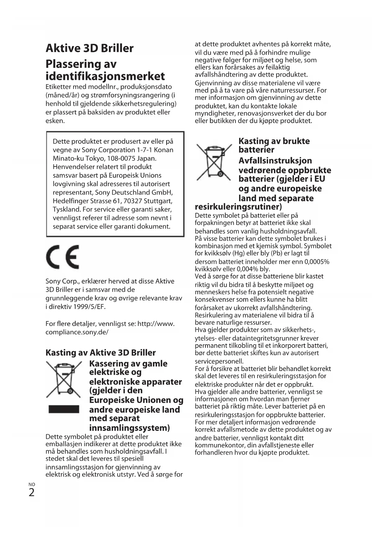 Aktive 3D Briller Plassering av identifikasjonsmerket Etiketter med modellnr., produksjonsdato (måned/år) og strømforsyningsrangering (i henhold til gjeldende sikkerhetsregulering) er plassert på baksiden av produktet eller esken. Dette produktet er produsert av eller på vegne av Sony Corporation 1-7-1 Konan Minato-ku Tokyo, 108-0075 Japan. Henvendelser relatert til produkt samsvar basert på Europeisk Unions lovgivning skal adresseres til autorisert representant, Sony Deutschland GmbH, Hedelfinger Strasse 61, 70327 Stuttgart, Tyskland. For service eller garanti saker, vennligst referer til adresse som nevnt i separat service eller garanti dokument. Sony Corp., erklærer herved at disse Aktive 3D Briller er i samsvar med de grunnleggende krav og øvrige relevante krav i direktiv 1999/5/EF. For flere detaljer, vennligst se: http://www. compliance.sony.de/ Kasting av Aktive 3D Briller Kassering av gamle elektriske og elektroniske apparater (gjelder i den Europeiske Unionen og andre europeiske land med separat innsamlingssystem) Dette symbolet på produktet eller emballasjen indikerer at dette produktet ikke må behandles som husholdningsavfall. I stedet skal det leveres til spesiell innsamlingsstasjon for gjenvinning av elektrisk og elektronisk utstyr. Ved å sørge for at dette produktet avhentes på korrekt måte, vil du være med på å forhindre mulige negative følger for miljøet og helse, som ellers kan forårsakes av feilaktig avfallshåndtering av dette produktet. Gjenvinning av disse materialene vil være med på å ta vare på våre naturressurser. For mer informasjon om gjenvinning av dette produktet, kan du kontakte lokale myndigheter, renovasjonsverket der du bor eller butikken der du kjøpte produktet. Kasting av brukte batterier Avfallsinstruksjon vedrørende oppbrukte batterier (gjelder i EU og andre europeiske land med separate resirkuleringsrutiner) Dette symbolet på batteriet eller på forpakningen betyr at batteriet ikke skal behandles som vanlig husholdningsavfall. På visse batterier kan dette symbolet brukes i kombinasjon med et kjemisk symbol. Symbolet for kvikksølv (Hg) eller bly (Pb) er lagt til dersom batteriet inneholder mer enn 0,0005% kvikksølv eller 0,004% bly. Ved å sørge for at disse batteriene blir kastet riktig vil du bidra til å beskytte miljøet og menneskers helse fra potensielt negative konsekvenser som ellers kunne ha blitt forårsaket av ukorrekt avfallshåndtering. Resirkulering av materialene vil bidra til å bevare naturlige ressurser. Hva gjelder produkter som av sikkerhets-, ytelses- eller dataintegritetsgrunner krever permanent tilkobling til et inkorporert batteri, bør dette batteriet skiftes kun av autorisert servicepersonell. For å forsikre at batteriet blir behandlet korrekt skal det leveres til en resirkuleringsstasjon for elektriske produkter når det er oppbrukt. Hva gjelder alle andre batterier, vennligst se informasjonen om hvordan man fjerner batteriet på riktig måte. Lever batteriet på en resirkuleringsstasjon for oppbrukte batterier. For mer detaljert informasjon vedrørende korrekt avfallsmetode av dette produktet og av andre batterier, vennligst kontakt ditt kommunekontor, din avfallstjeneste eller forhandleren hvor du kjøpte produktet.3