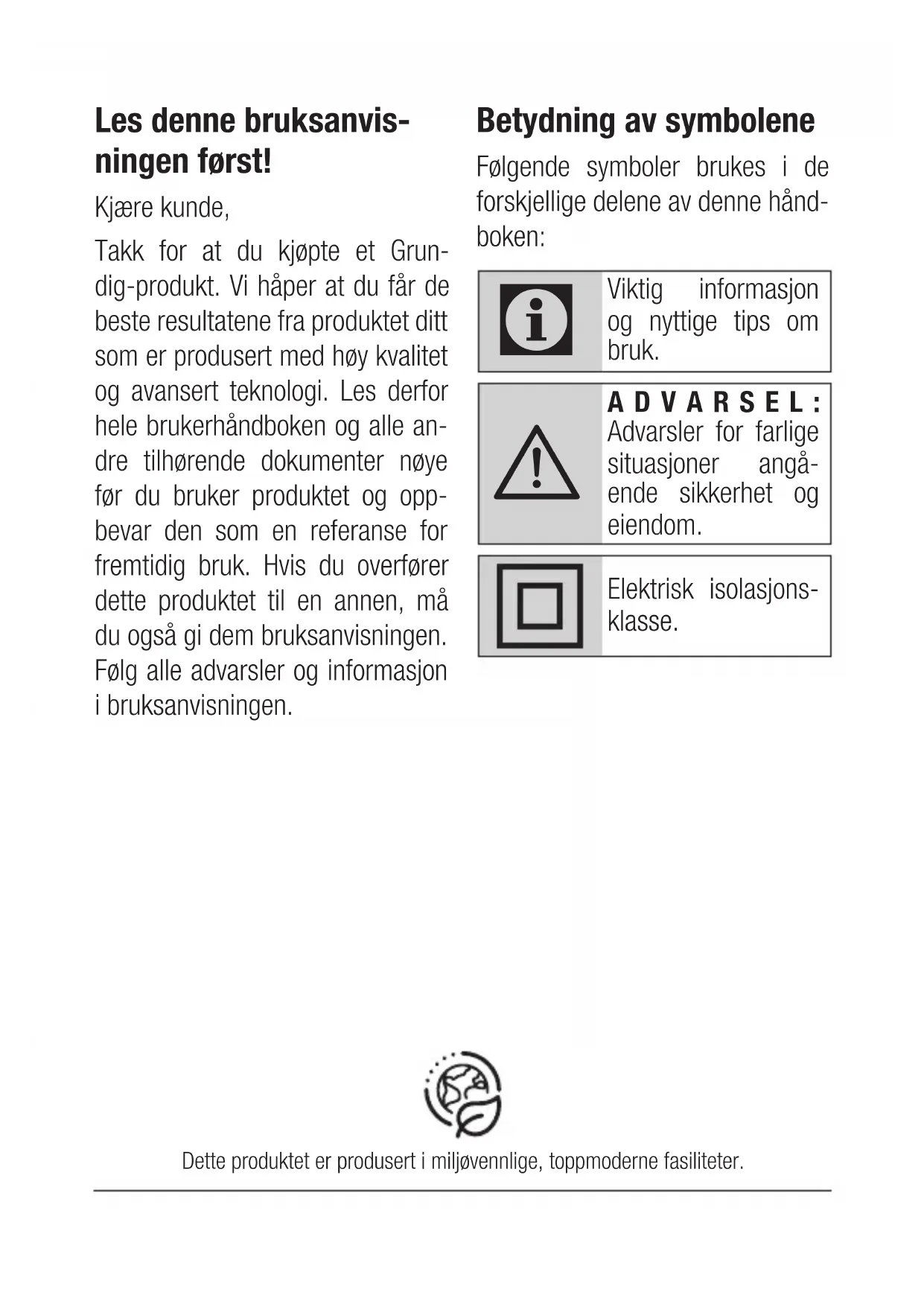 ADVARSEL: Advarsler for farlige situasjoner angå- ende sikkerhet og eiendom. Elektrisk isolasjons- klasse. Dette produktet er produsert i miljøvennlige, toppmoderne fasiliteter.59 / NO Hårstyler for rett hår og krøller / Brukerhåndbok Les disse instruksjonene nøye før du bruker den- ne enheten. Følg alle sikkerhetsinstruksjonene! Skade kan oppstå ved feil bruk av enheten. Oppbevar disse instruksjonene for fremtidig bruk. Dersom enheten overføres til en tredjepart, må disse instruksjonene også sendes videre til den nye eieren eller brukeren.